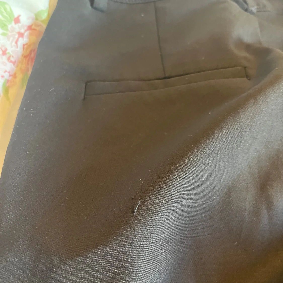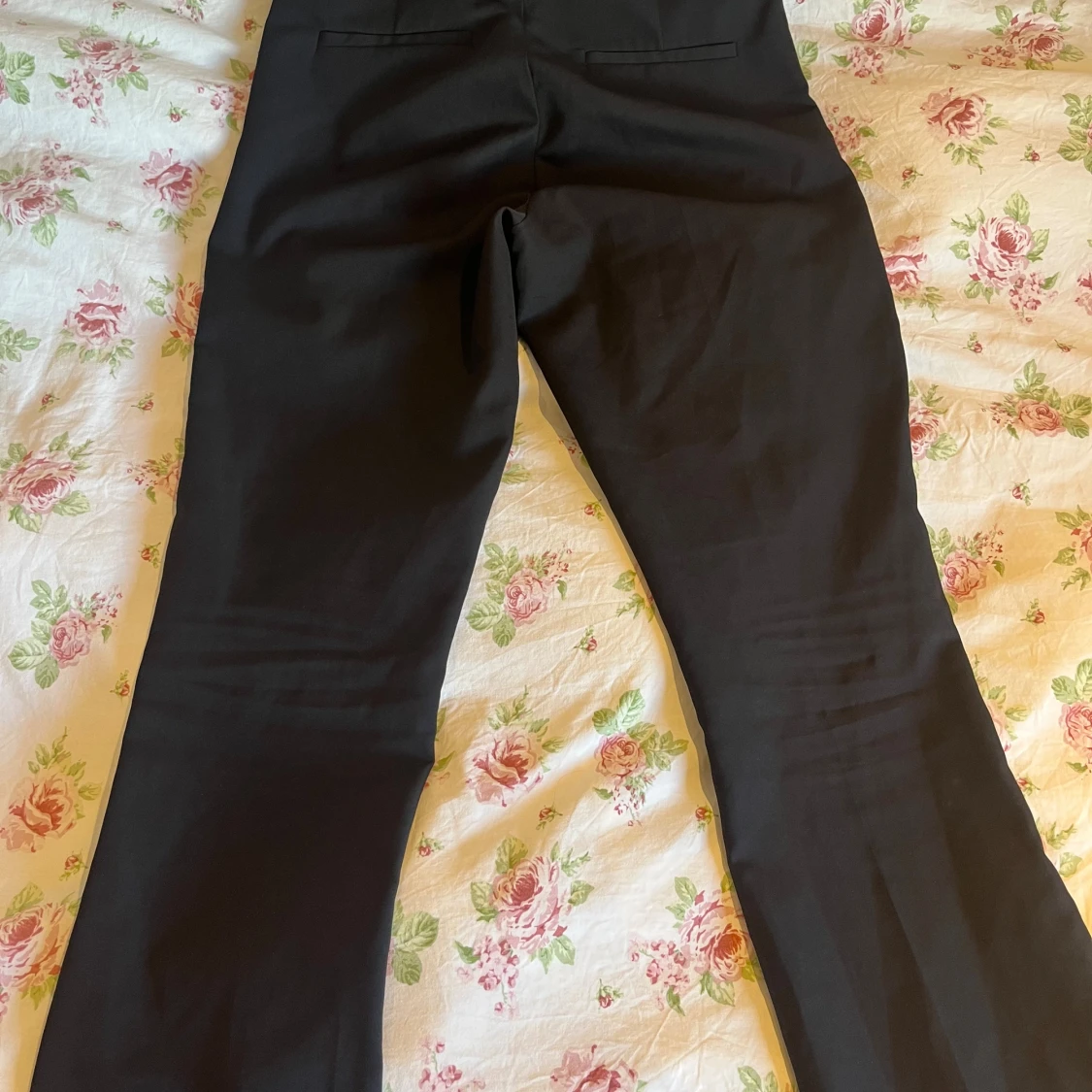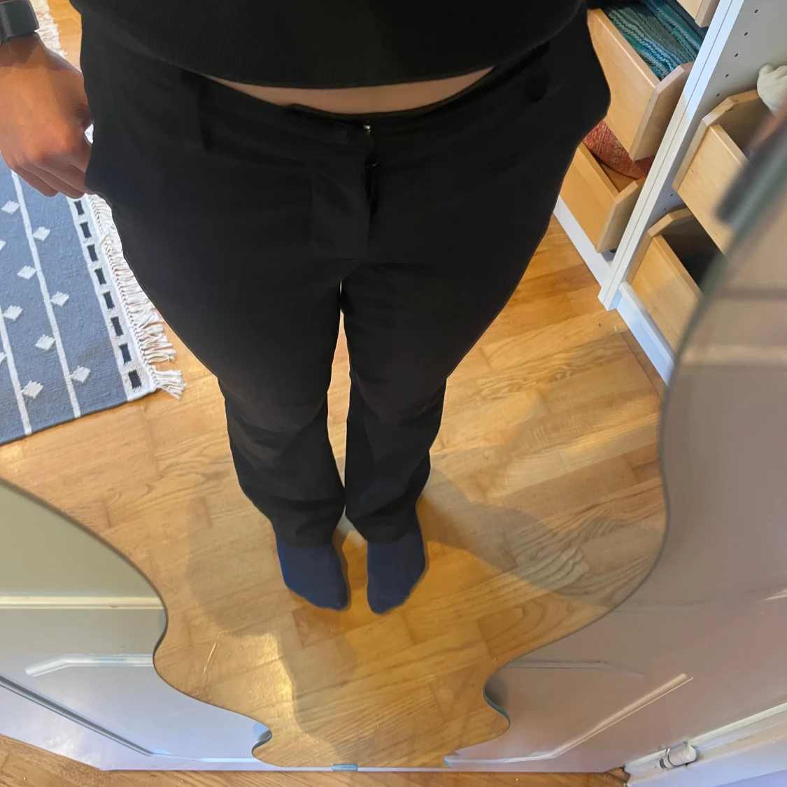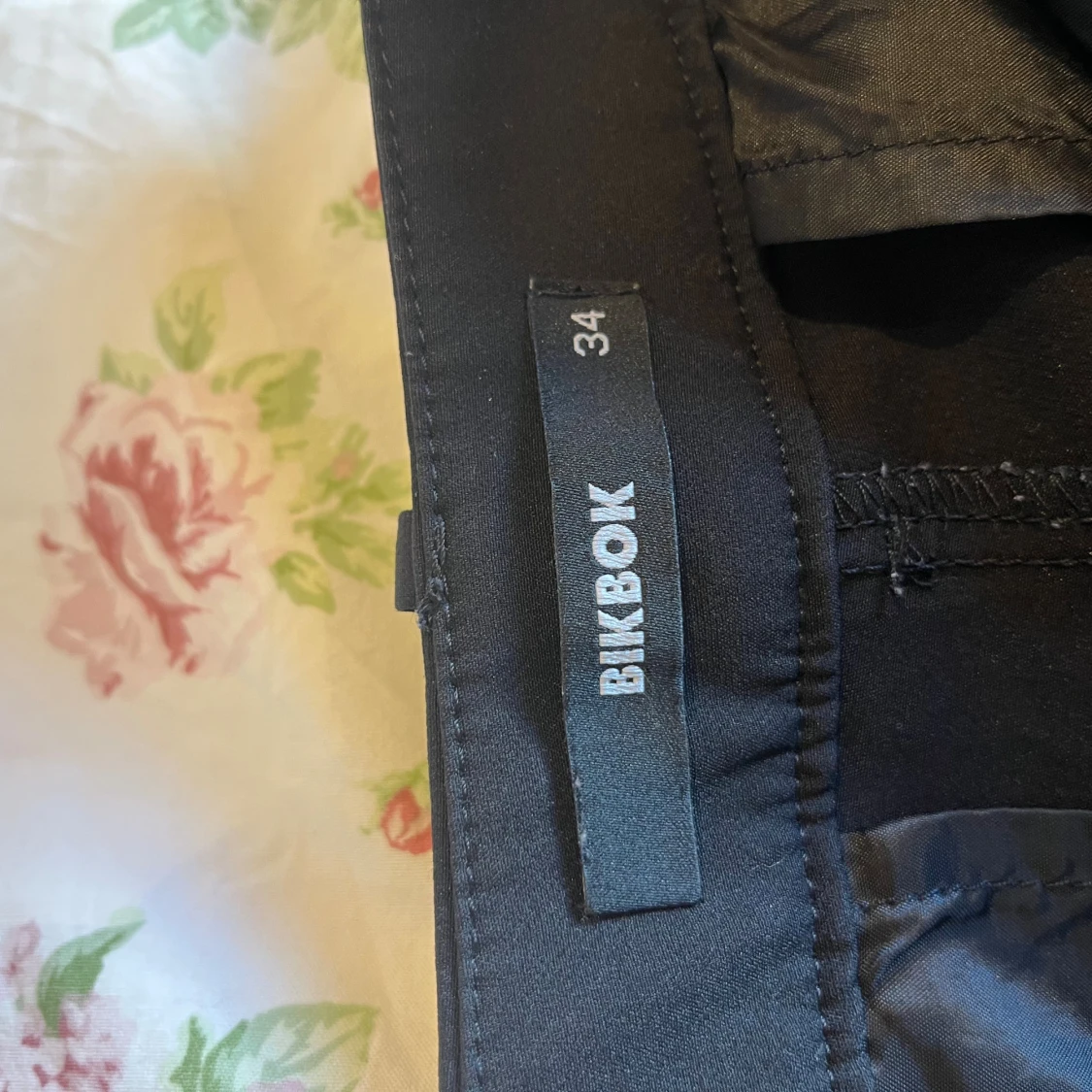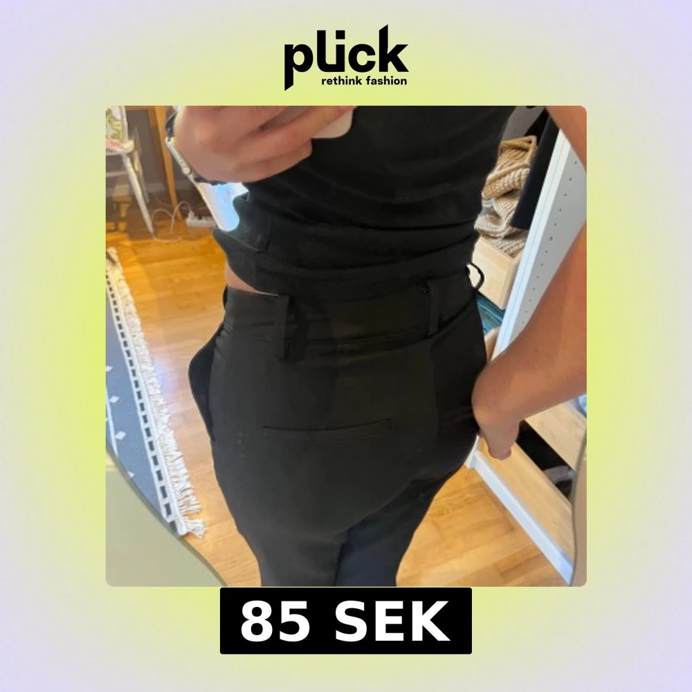 Svarta kostymbyxor från BikBok i klassisk rak modell med diskreta bakfickor och hällor för bälte. Byxorna har en snygg midwaist/lowwaist-passform och är tillverkade i ett slätt, mjukt material som ger en clean look. Perfekta för en stilren outfit. Som du ser på sista bilden så finns det en tråd som står ut lite. Inget som syns så mycket när du har på dig dem, men bra att vara medveten om det❤️