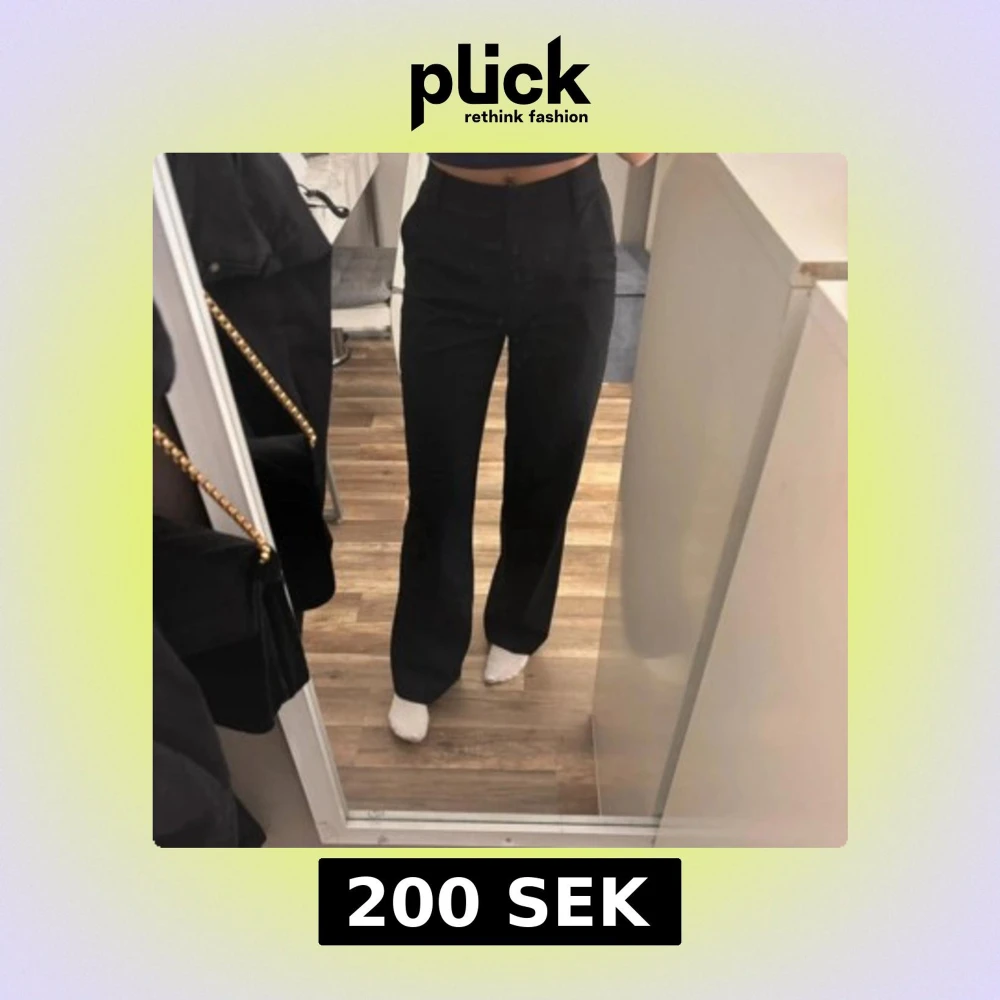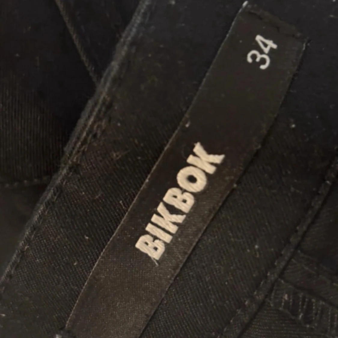 Snygga svarta kostymbyxor från BikBok i storlek 34. De har hög midja och bootcut-modell som ger en schysst siluett. Byxorna är i ett mjukt bomullsmaterial med lite stretch, perfekta till sneakers eller boots.