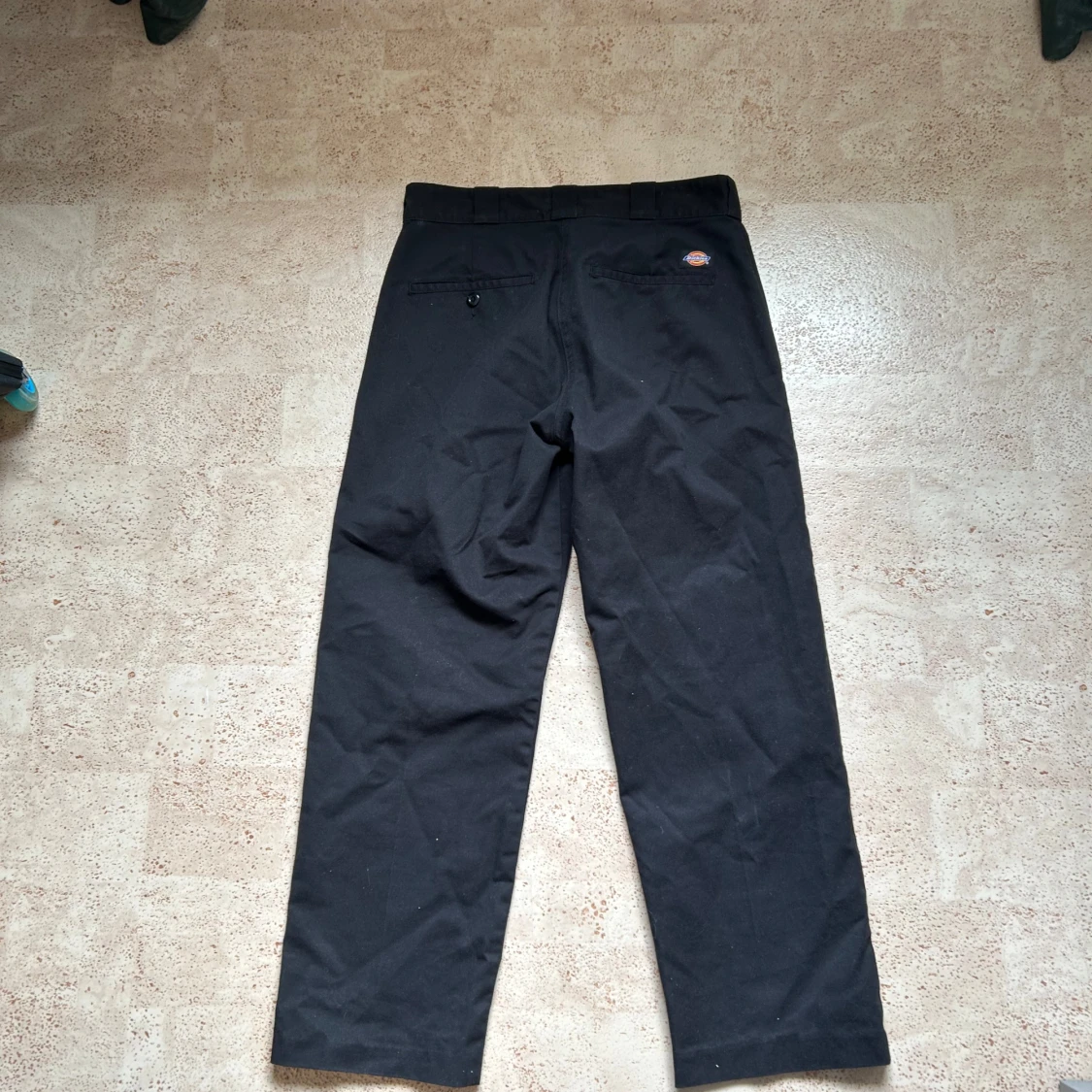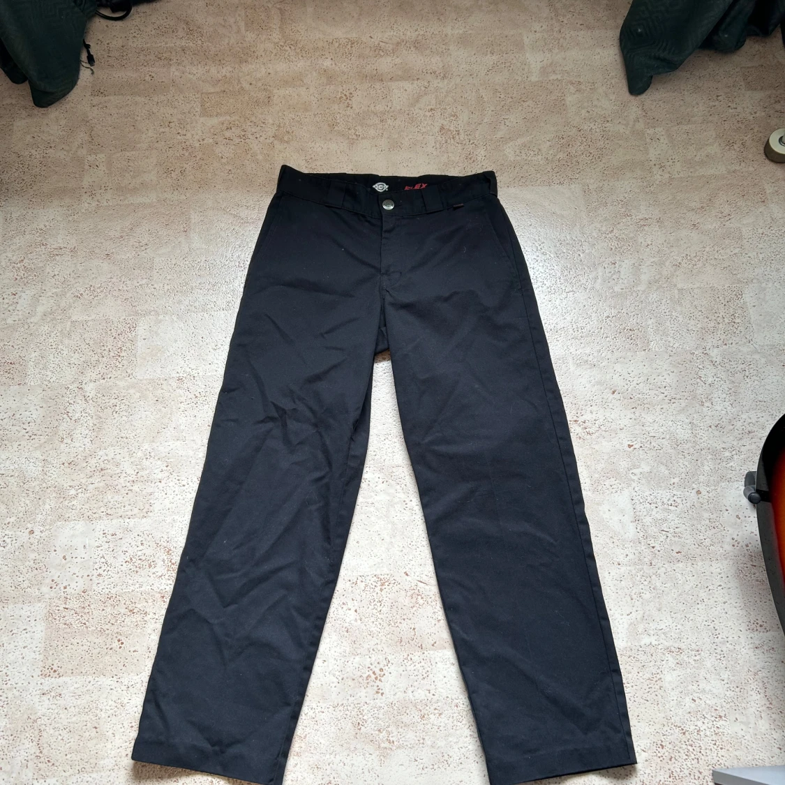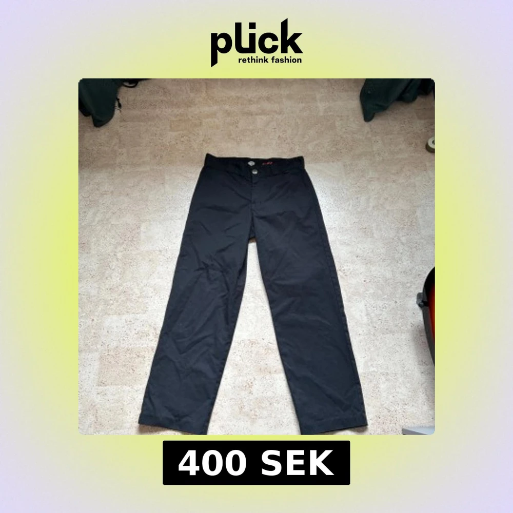 Säljer ett par svarta kostymbyxor från Dickies med klassisk passform och raka ben. Byxorna har dragkedja och knapp framtill samt Dickies-logga ovanför ena bakfickan. Perfekta för en clean och stilren look.