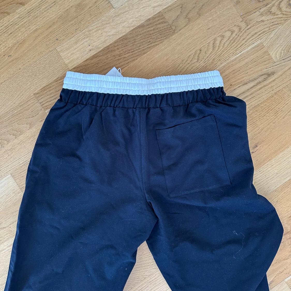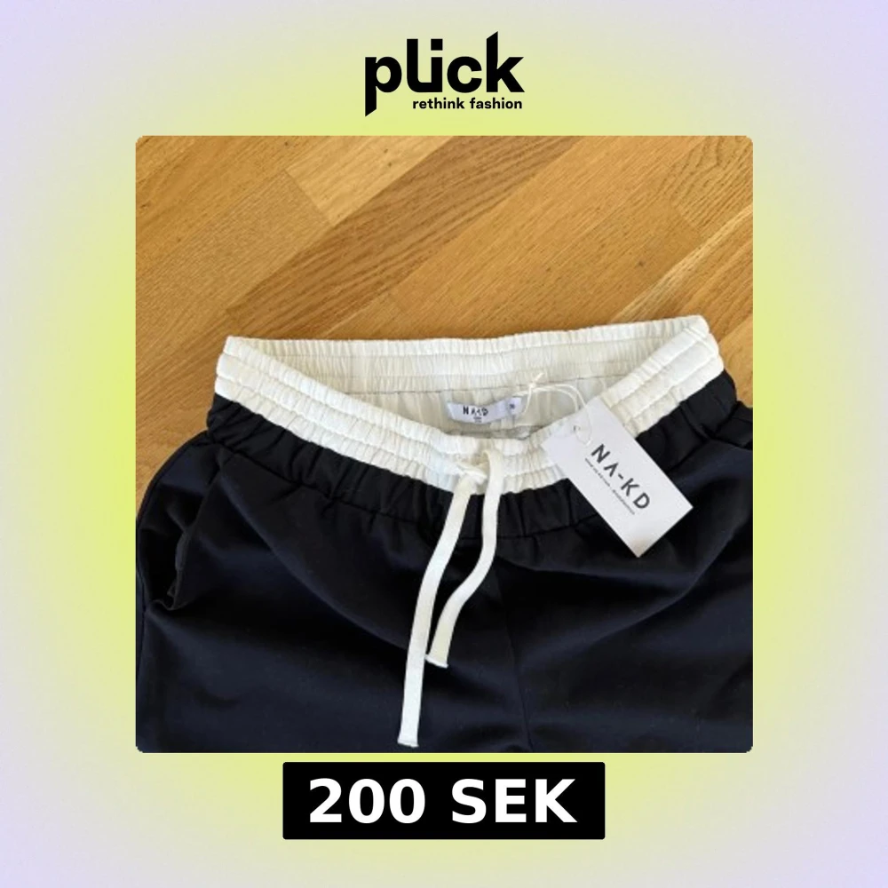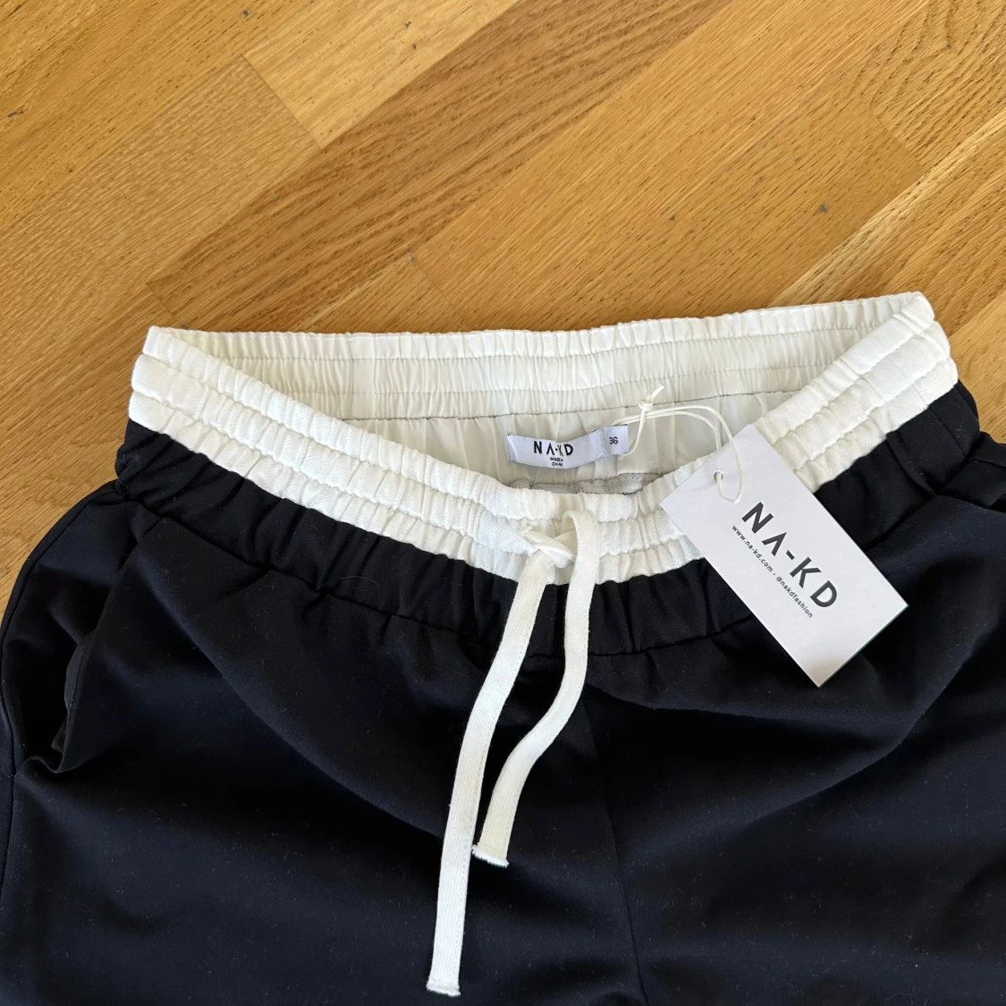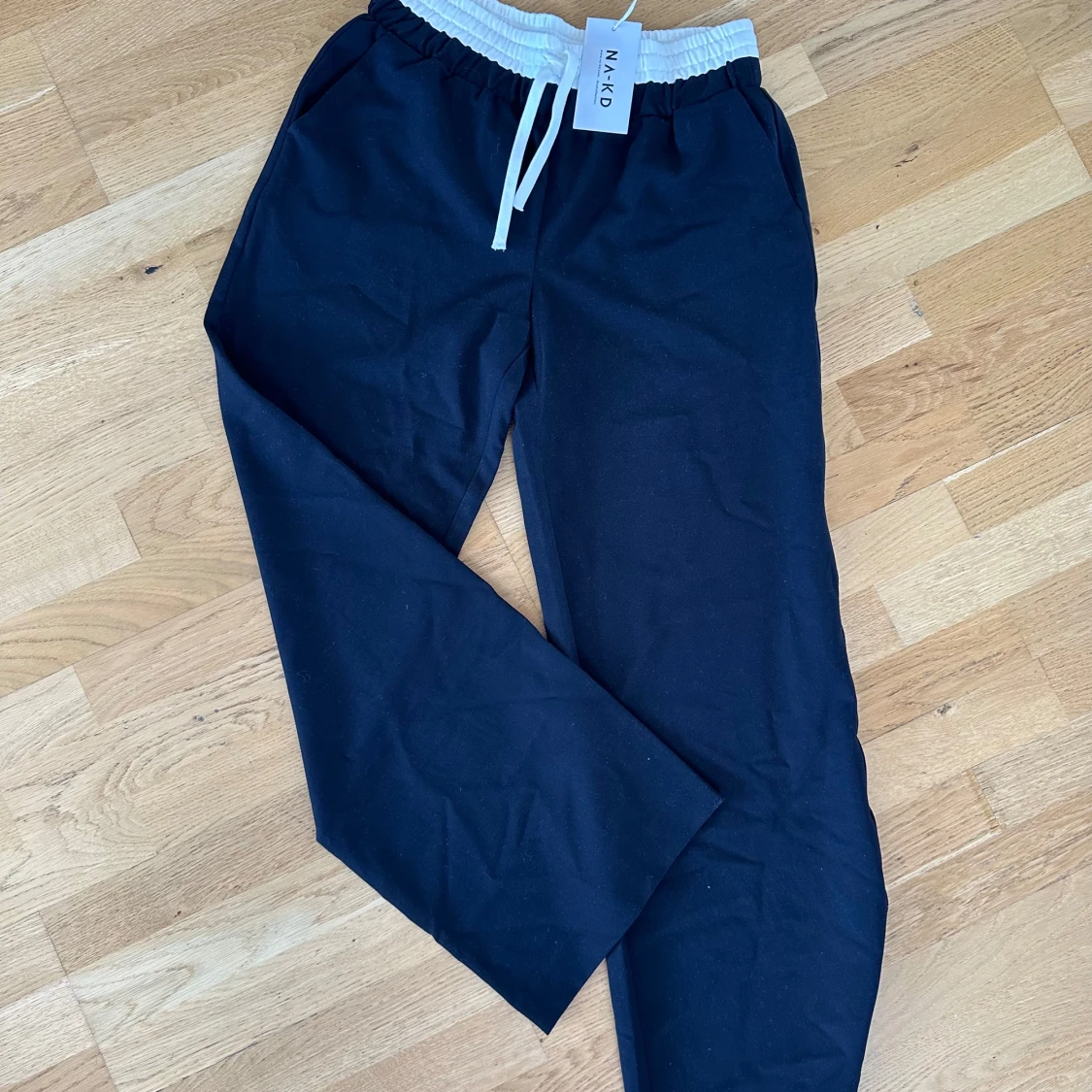 Svarta kostymbyxor från NA-KD med vit, ribbad midja och snörning. Byxorna har raka ben, sidofickor och en bakficka. Perfekta för chill dagar och har en clean, stilren look med kontrast i midjan. Materialet är mjukt och skönt, troligtvis bomull eller polyester.
