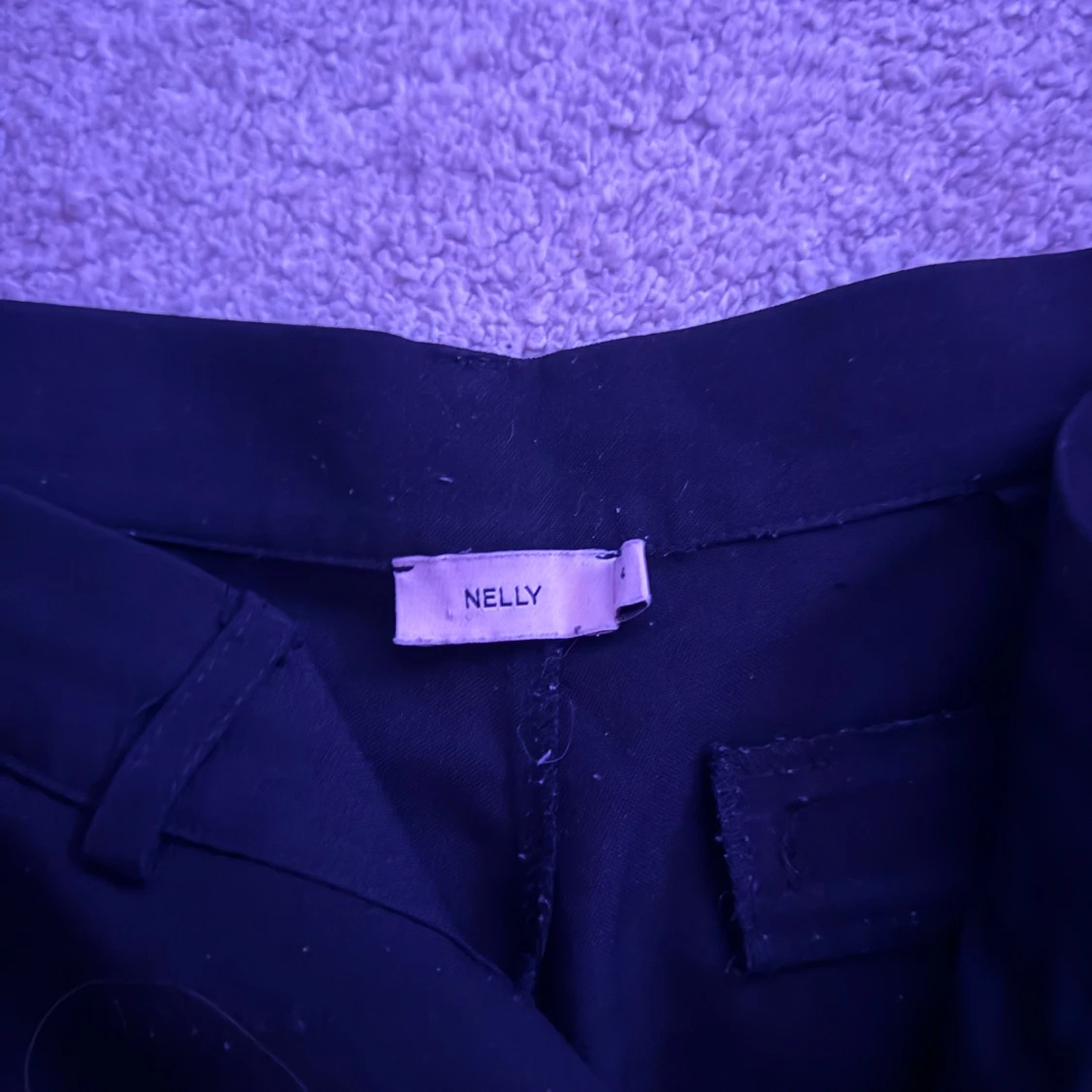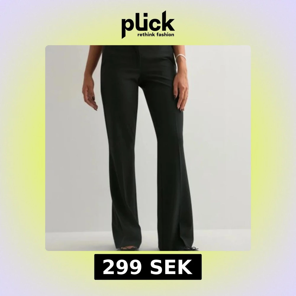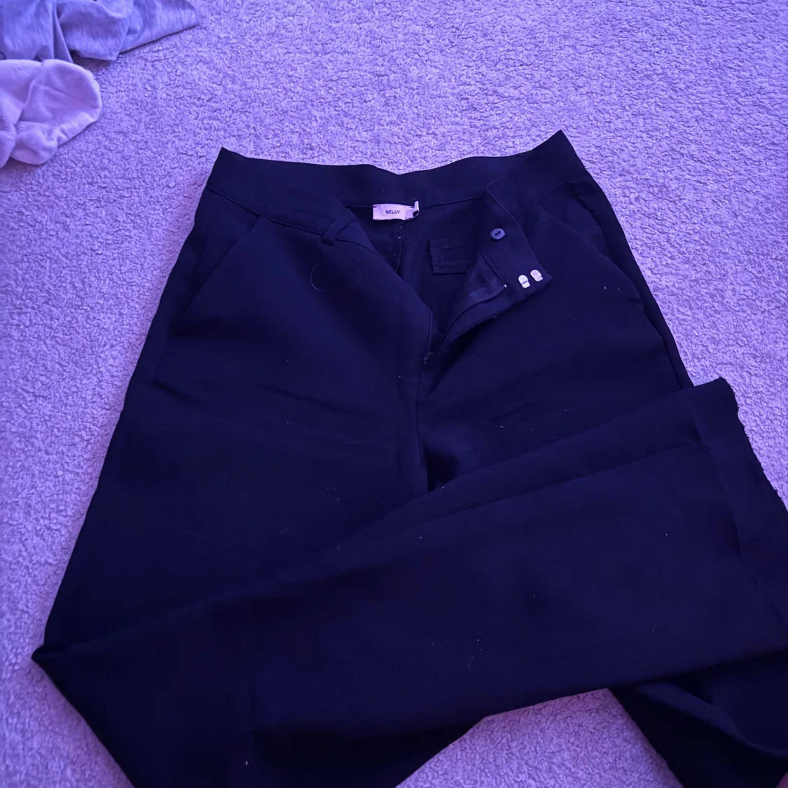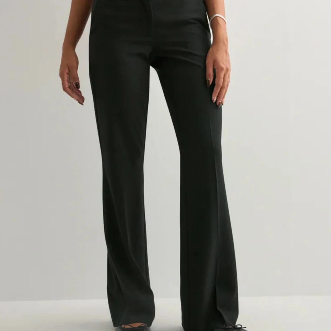 Säljer ett par lågmidjade svarta kostymbyxor från Nelly med klassisk rak passform och diskreta fickor. Byxorna har hällor för bälte och stängs med dragkedja och knappar. Perfekta för en clean och stilren look.