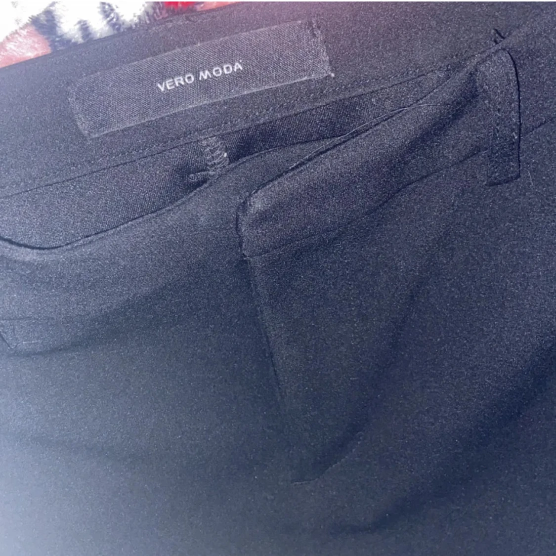 Säljer ett par svarta kostymbyxor från Vero Moda. Byxorna har en klassisk rak passform med midja och diskreta fickor. Snygga att styla med crop top eller skjorta. Materialet känns mjukt och har lite stretch för extra komfort. Passar korta ben