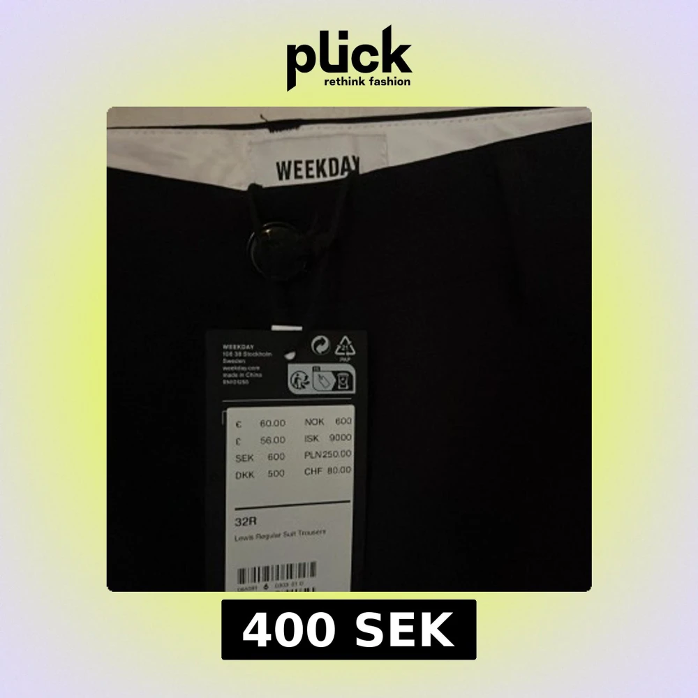 Oanvända svarta kostymbyxor från Weekday med en klassisk rak passform. Byxorna har en stilren design med knappar bak och är perfekta för en dressad look. Passar bra till både formella och avslappnade tillfällen.