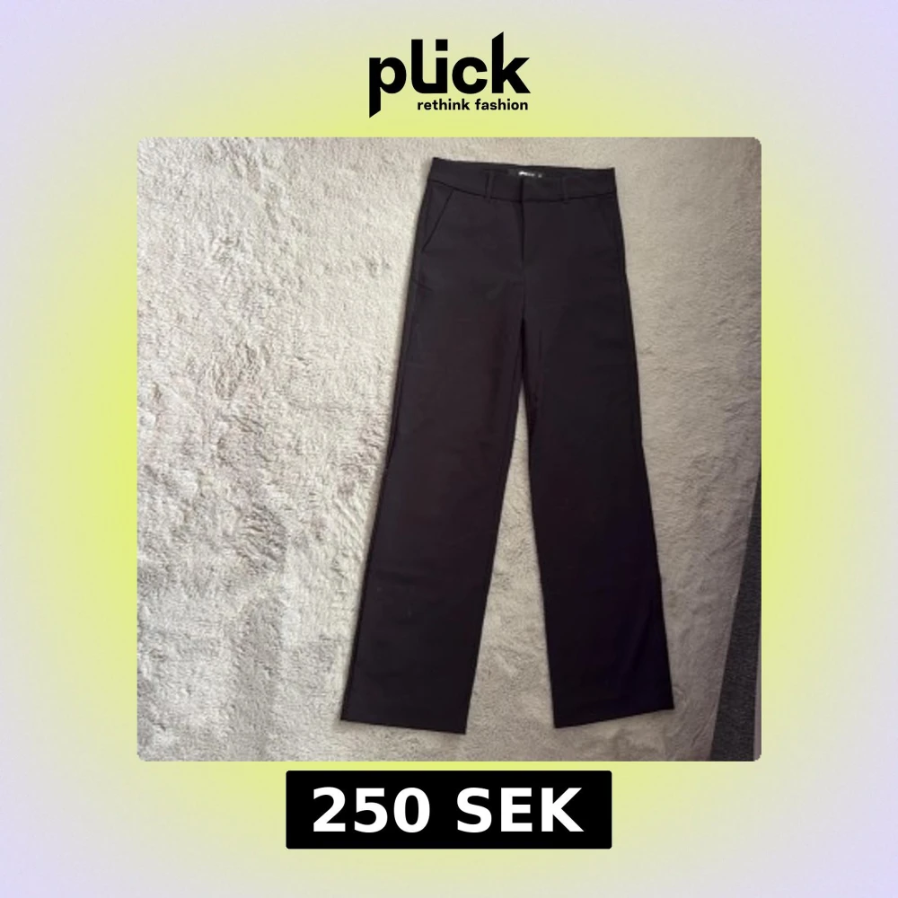 Stilrena svarta kostymbyxor från Gina Tricot i storlek 32. Byxorna har hög midja, raka ben och hällor för bälte. Klassisk design med fickor fram och en fuskficka bak. Perfekta för en clean och snygg look.