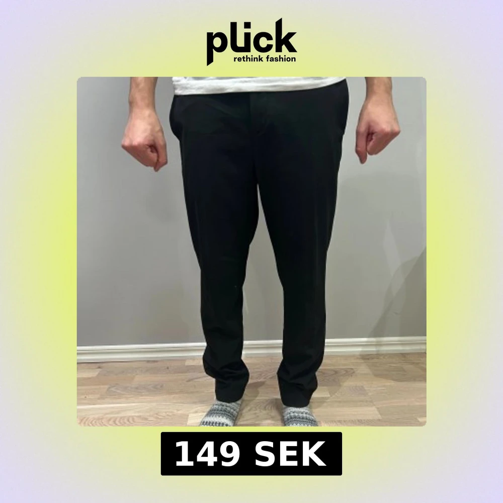 Svarta kostymbyxor från H&M i slim fit-modell. Byxorna har raka ben, diskreta sidfickor och bakfickor med knapp. Materialet är mjukt och har en snygg, klassisk look som passar till skjorta eller t-shirt. Perfekt för dig som gillar stilrena och enkla plagg.