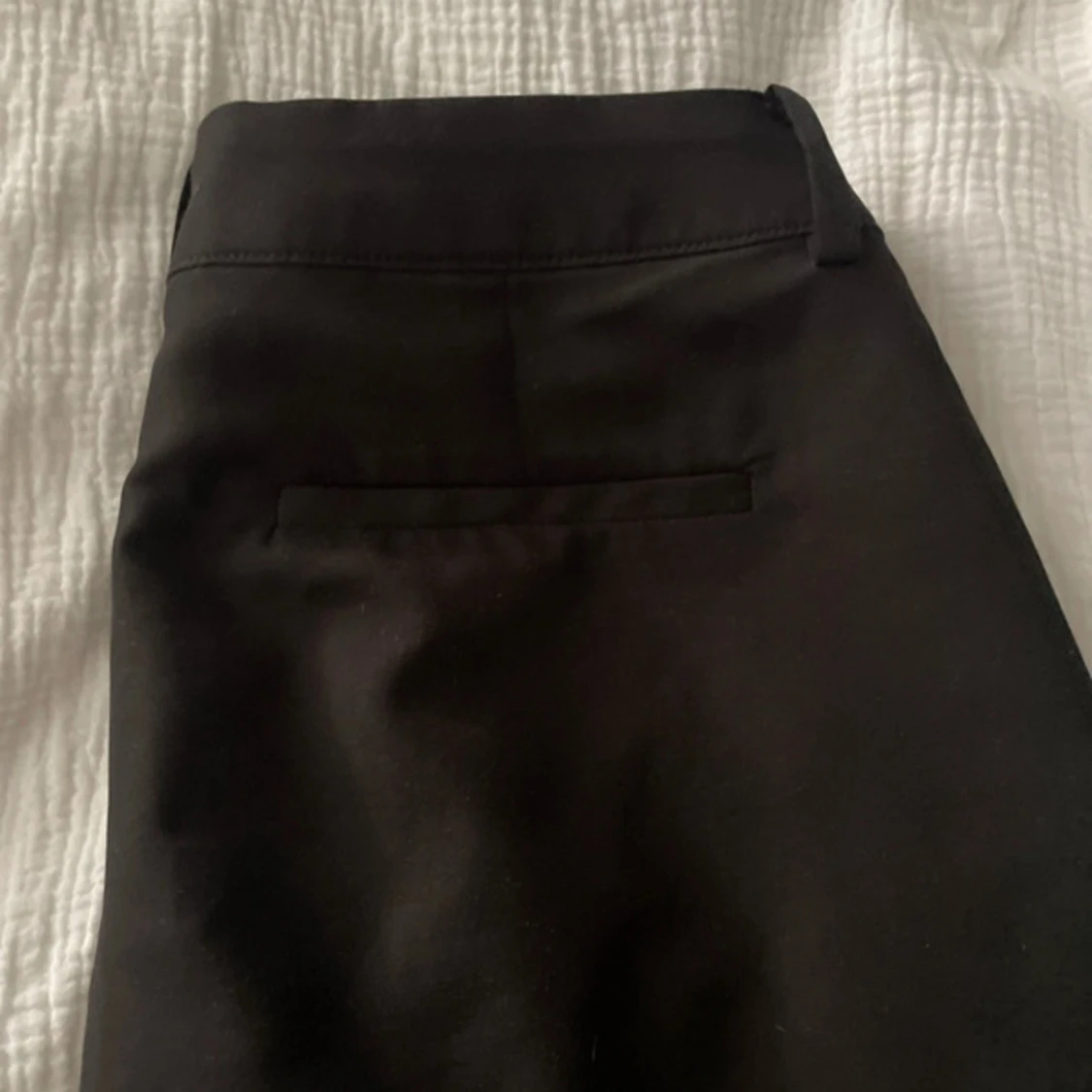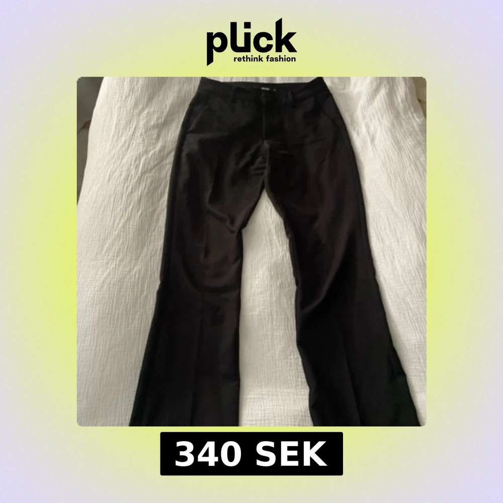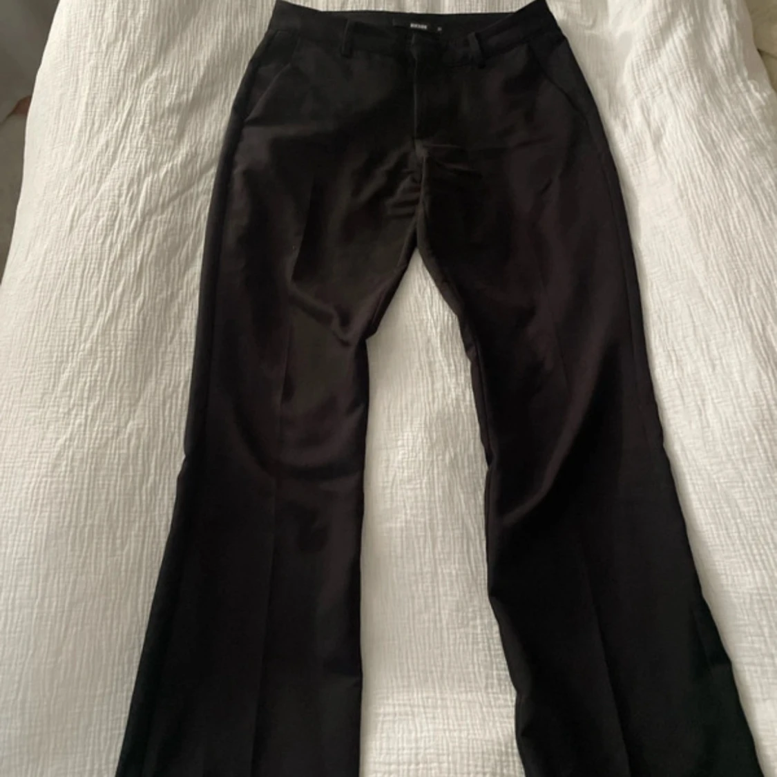Snygga svarta kostymbyxor med utsvängda ben och klassisk passform. Byxorna har diskreta fickor och bälteshällor i midjan. Perfekta för en clean och stilren look, passar till skjorta eller t-shirt. Materialet är slätt och ger en dressad känsla.