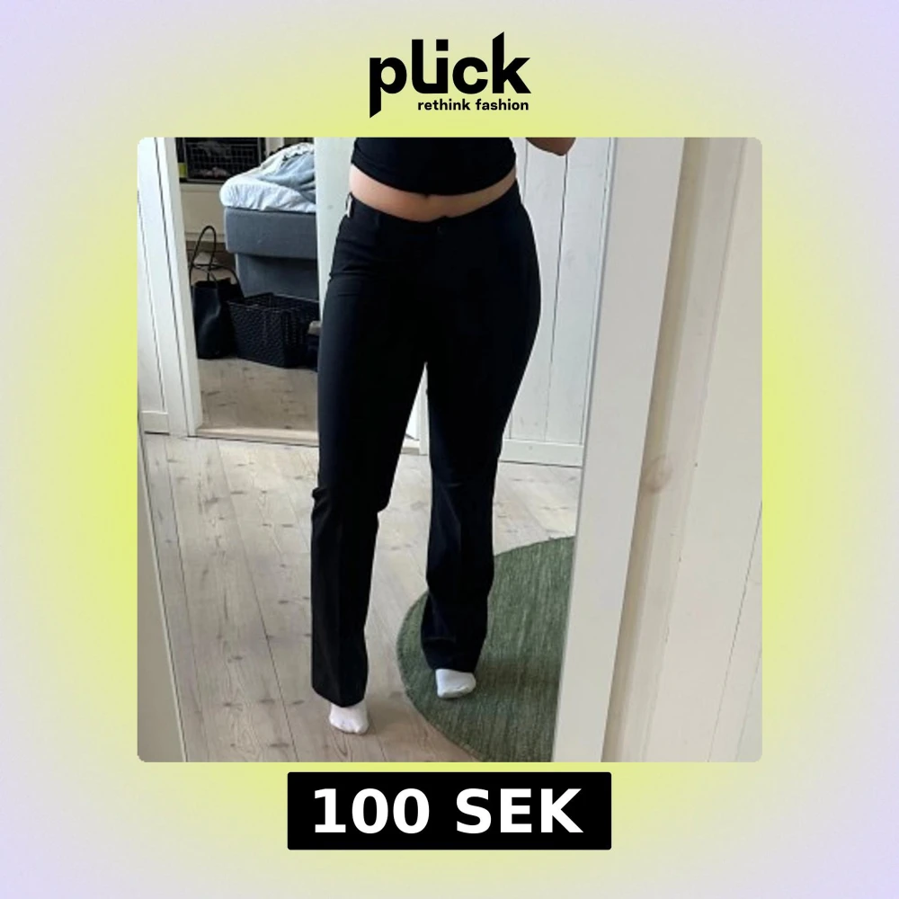 Säljer ett par svarta kostymbyxor med bootcut passform och hög midja. Byxorna har klassisk look med raka ben som blir lite utsvängda nertill. Perfekta till en snygg topp eller skjorta. Den har en snygg metall detalj som är ett ”J” på sidan.