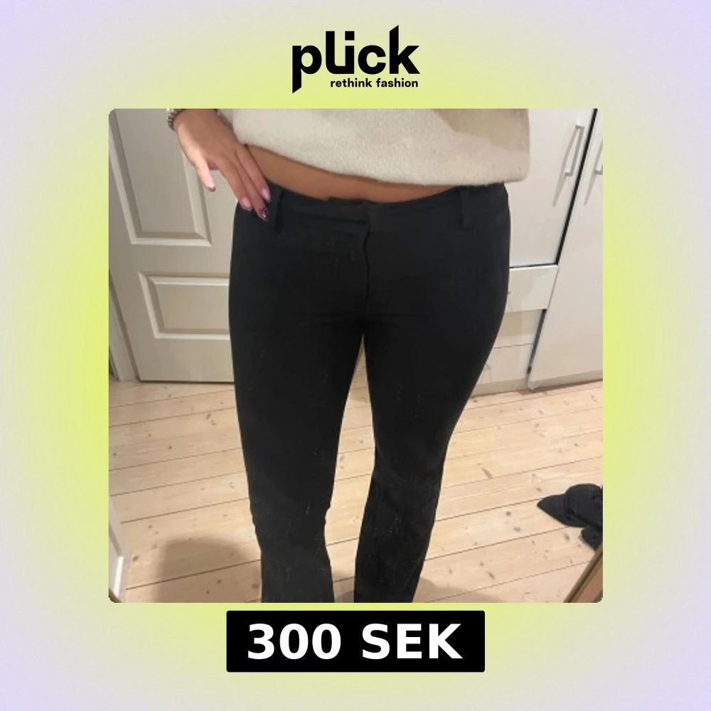 Snygga svarta kostymbyxor med bootcut och låg midja. Byxorna har klassiska hällor för bälte och stängs med dragkedja och knapp. Storlek M men skulle säga att det är mer som S💓