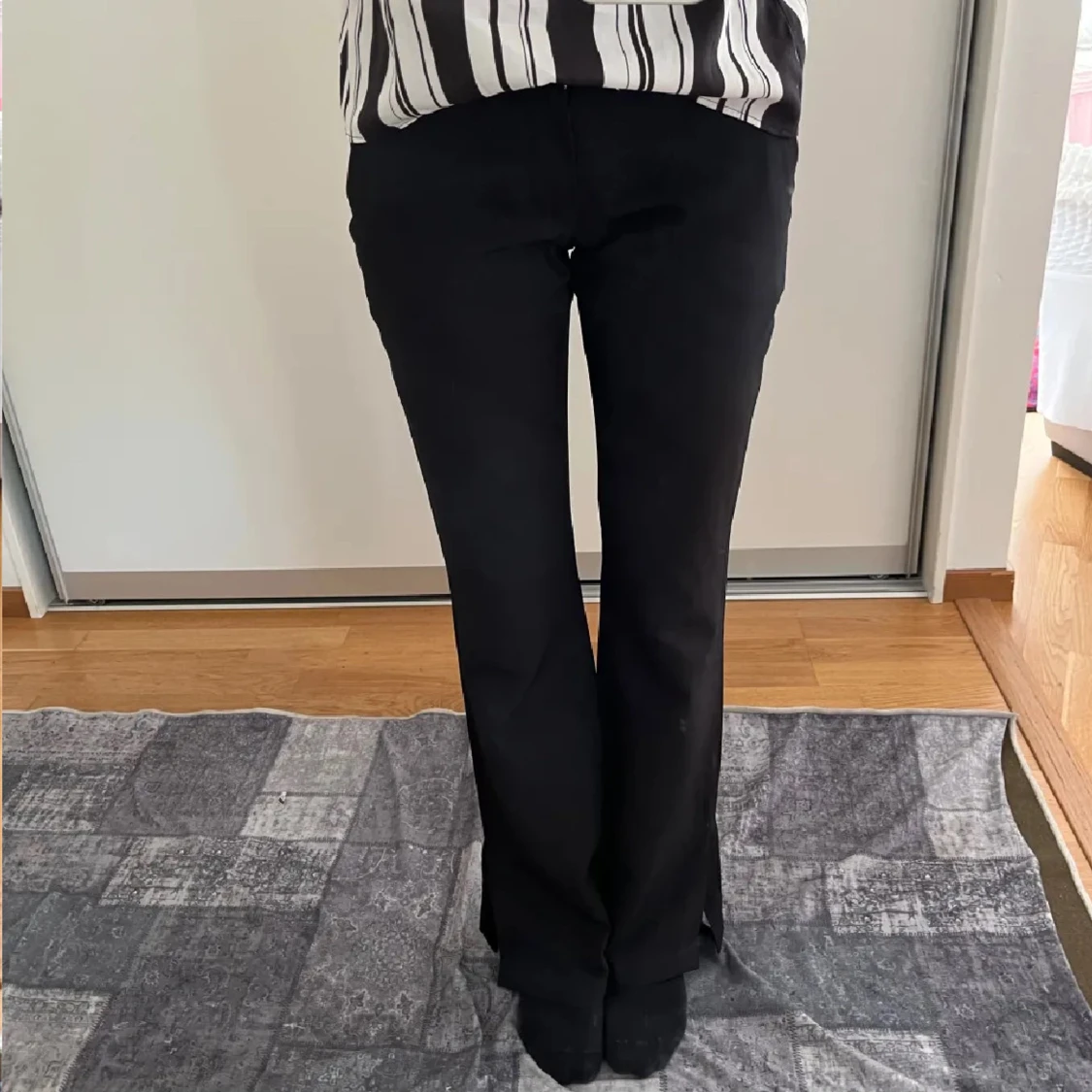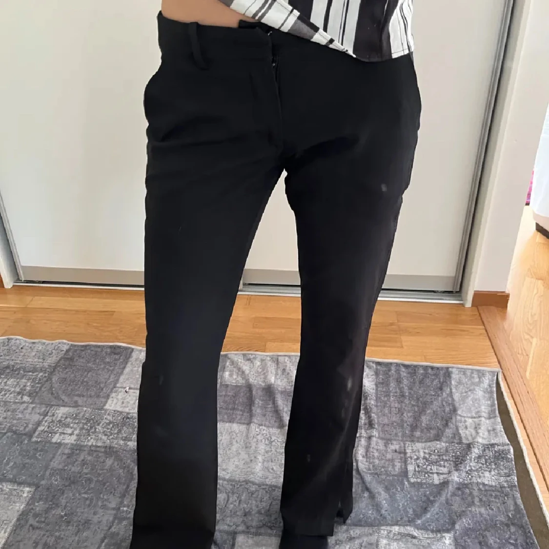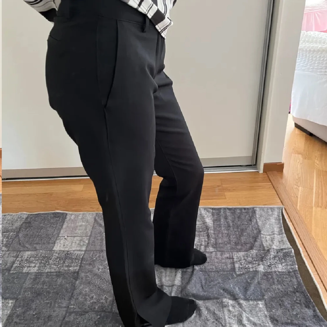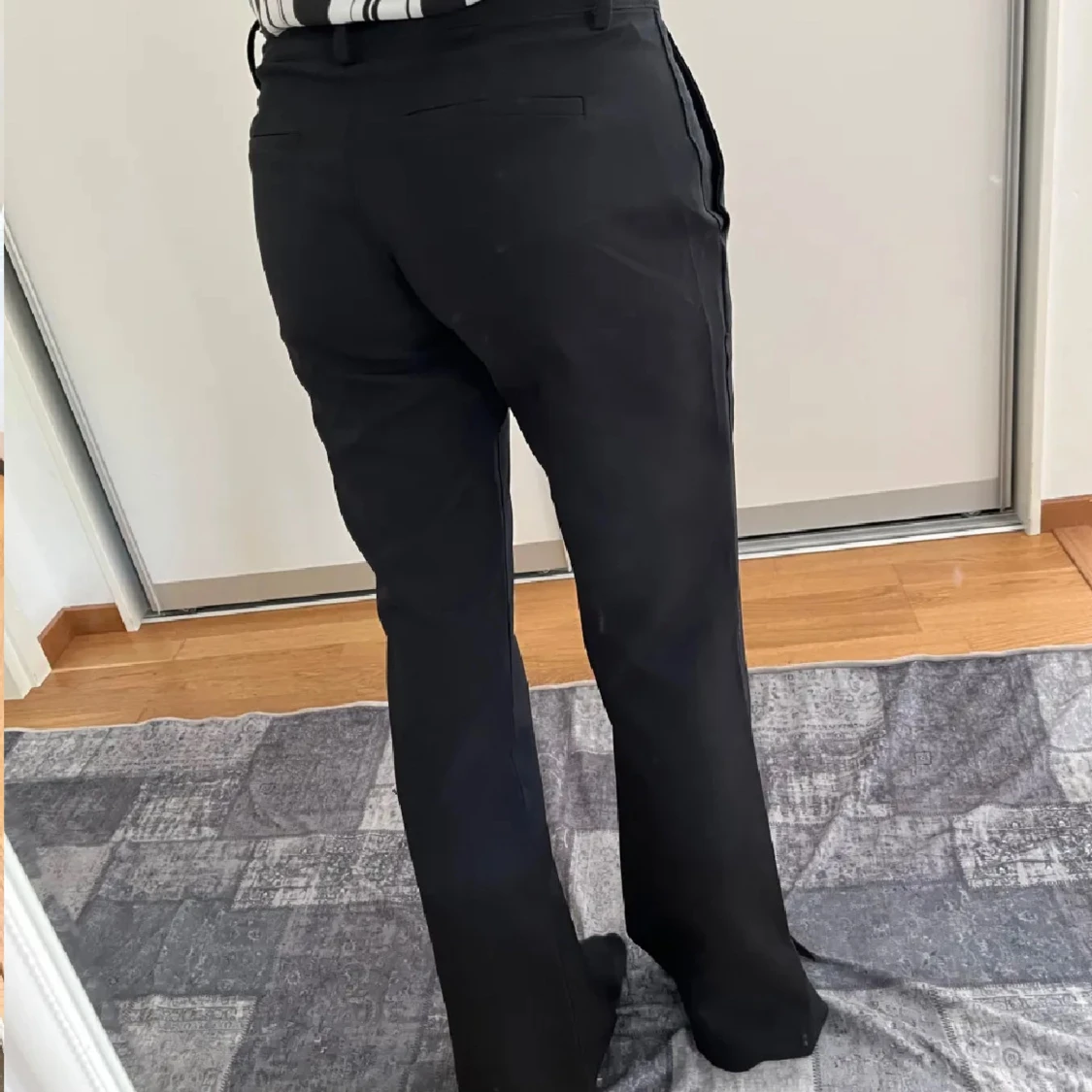 Snygga svarta kostymbyxor med klassisk bootcut och hög midja. Byxorna har diskreta fickor bak och bälteshällor i midjan. Perfekta för en clean och stilren look. Materialet känns mjukt och följsamt, vilket gör dem bekväma hela dagen.