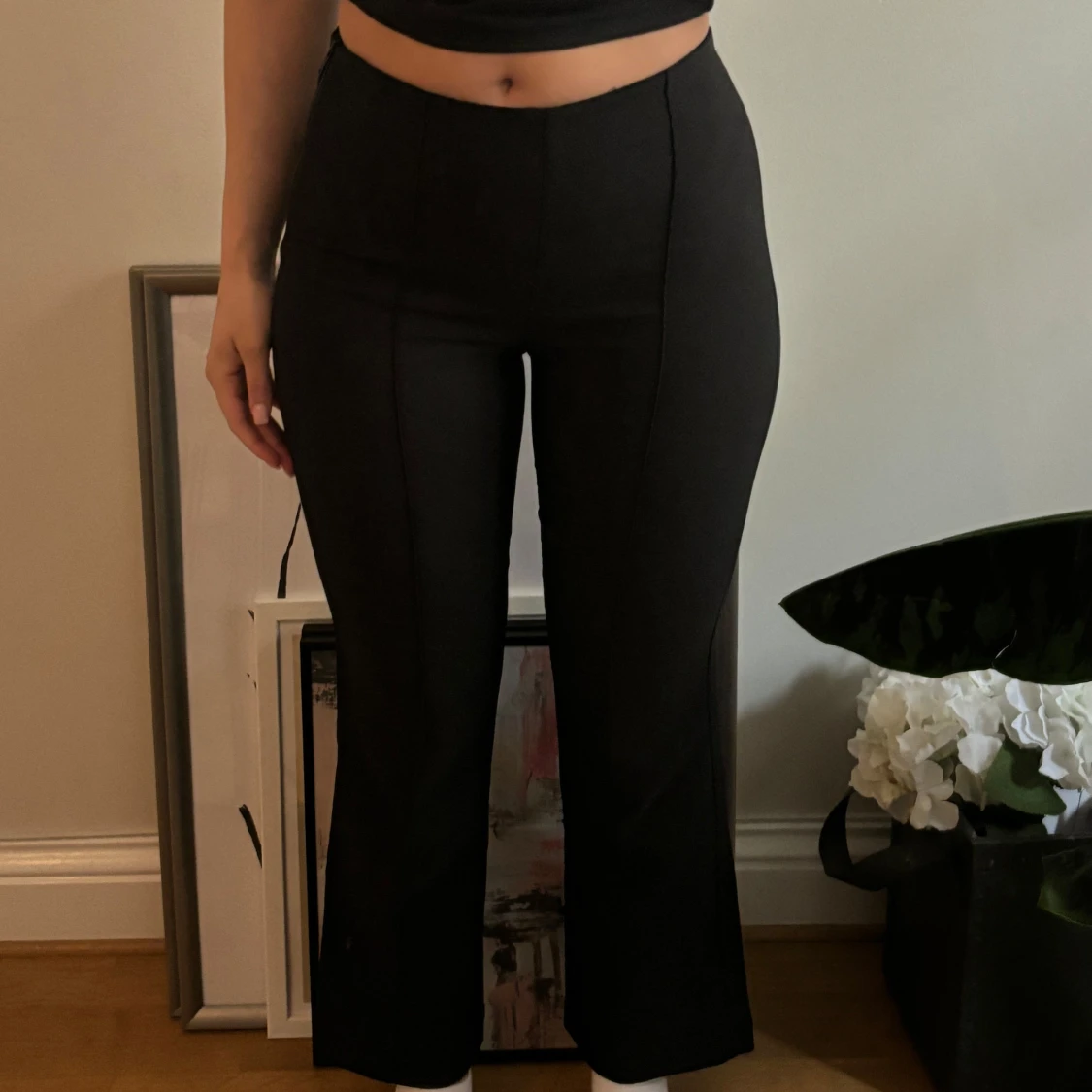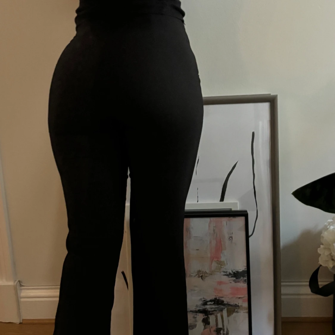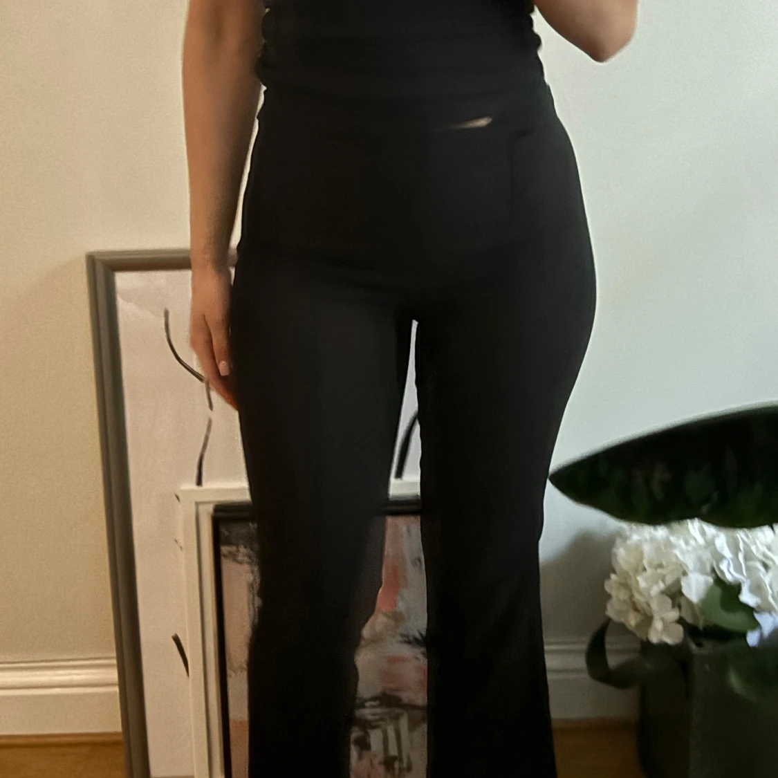 Svarta kostymbyxor med bootcut-snitt och låg midja. Byxorna har en klassisk look och är tillverkade i ett slätt material som ger en dressad känsla. Från Gina tricot, knappt använda. Större i storleken trots storlek 32, annars hade jag inte fått på mig dem