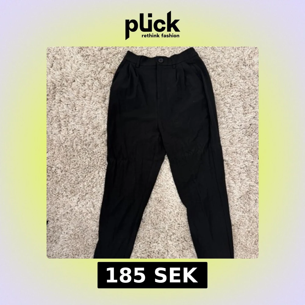 Säljer ett par svarta kostymbyxor med hög midja och klassisk passform. Byxorna har hällor för bälte och stängs med knapp och dragkedja framtill. Perfekta för en stilren och enkel look.