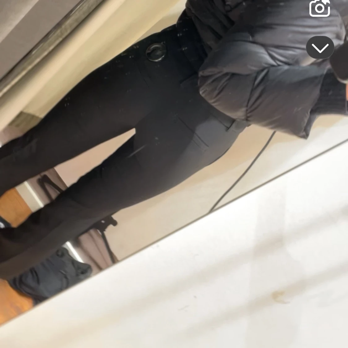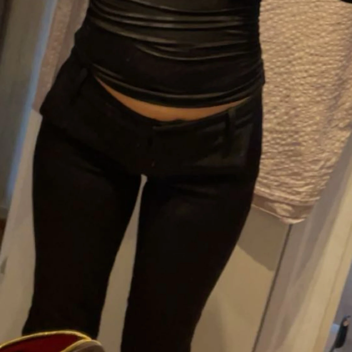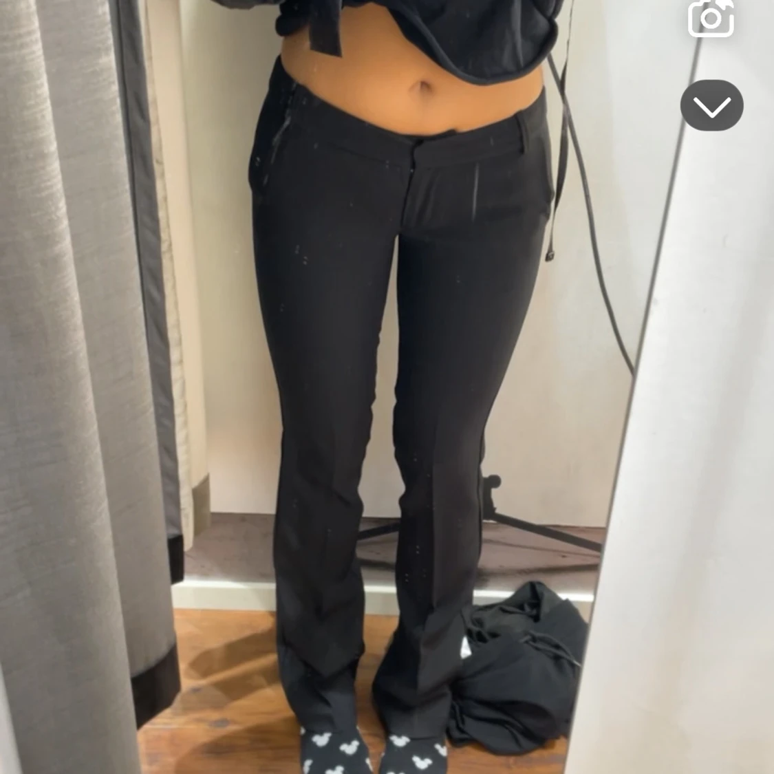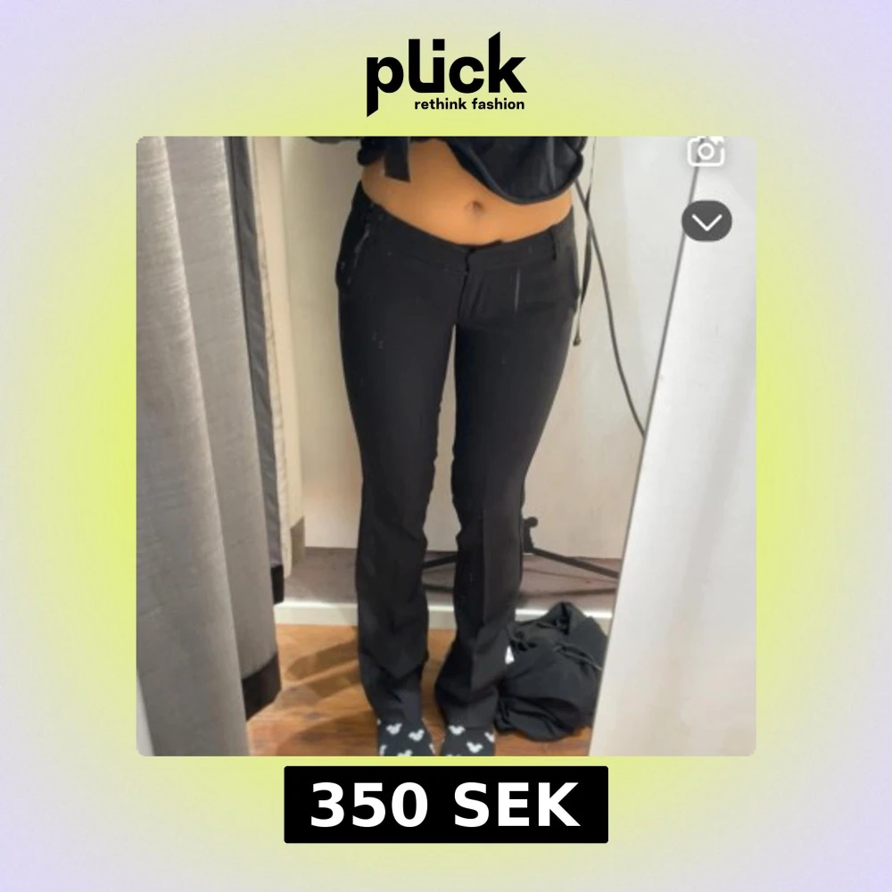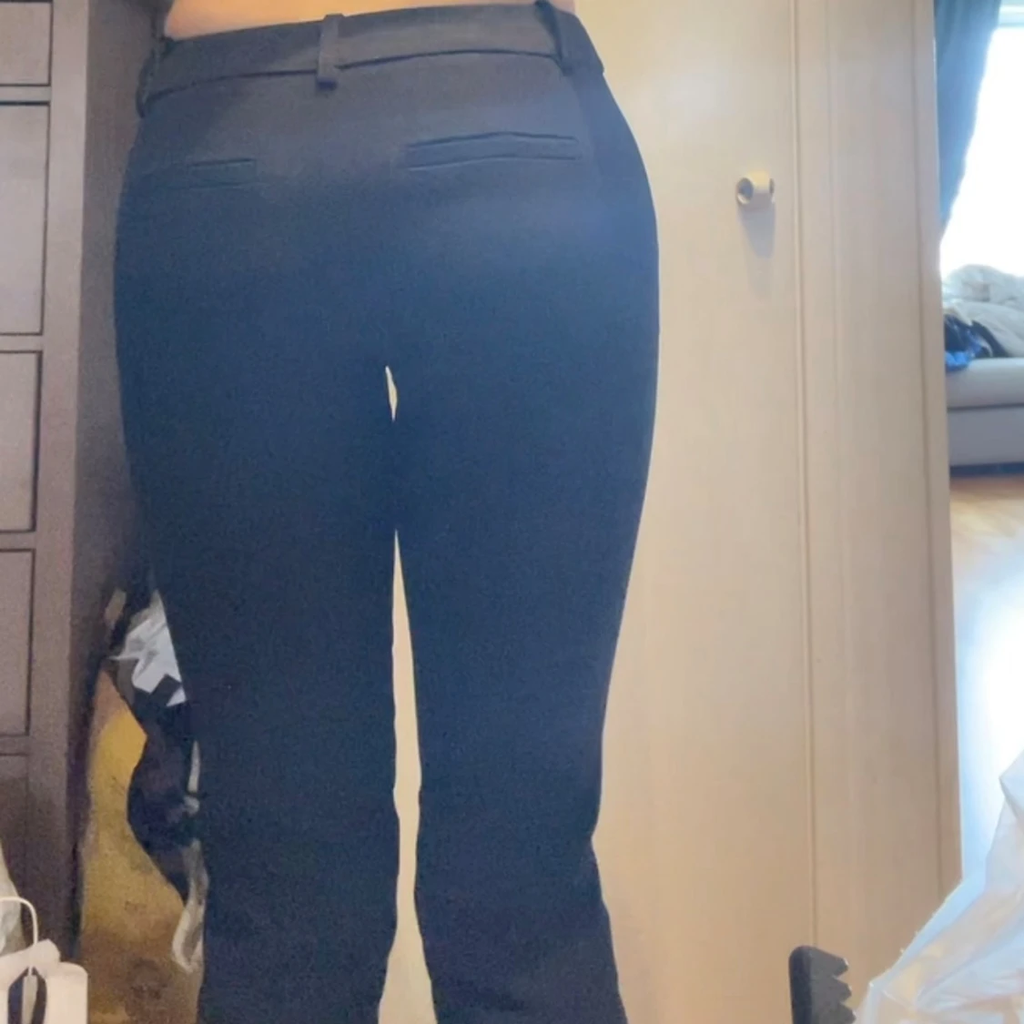 Säljer ett par svarta kostymbyxor med låg midja och raka ben. Byxorna har bälteshällor, fickor bak och klassisk stängning fram. Snygg passform som sitter tajt över höfterna och låren, perfekt till en trendig look.