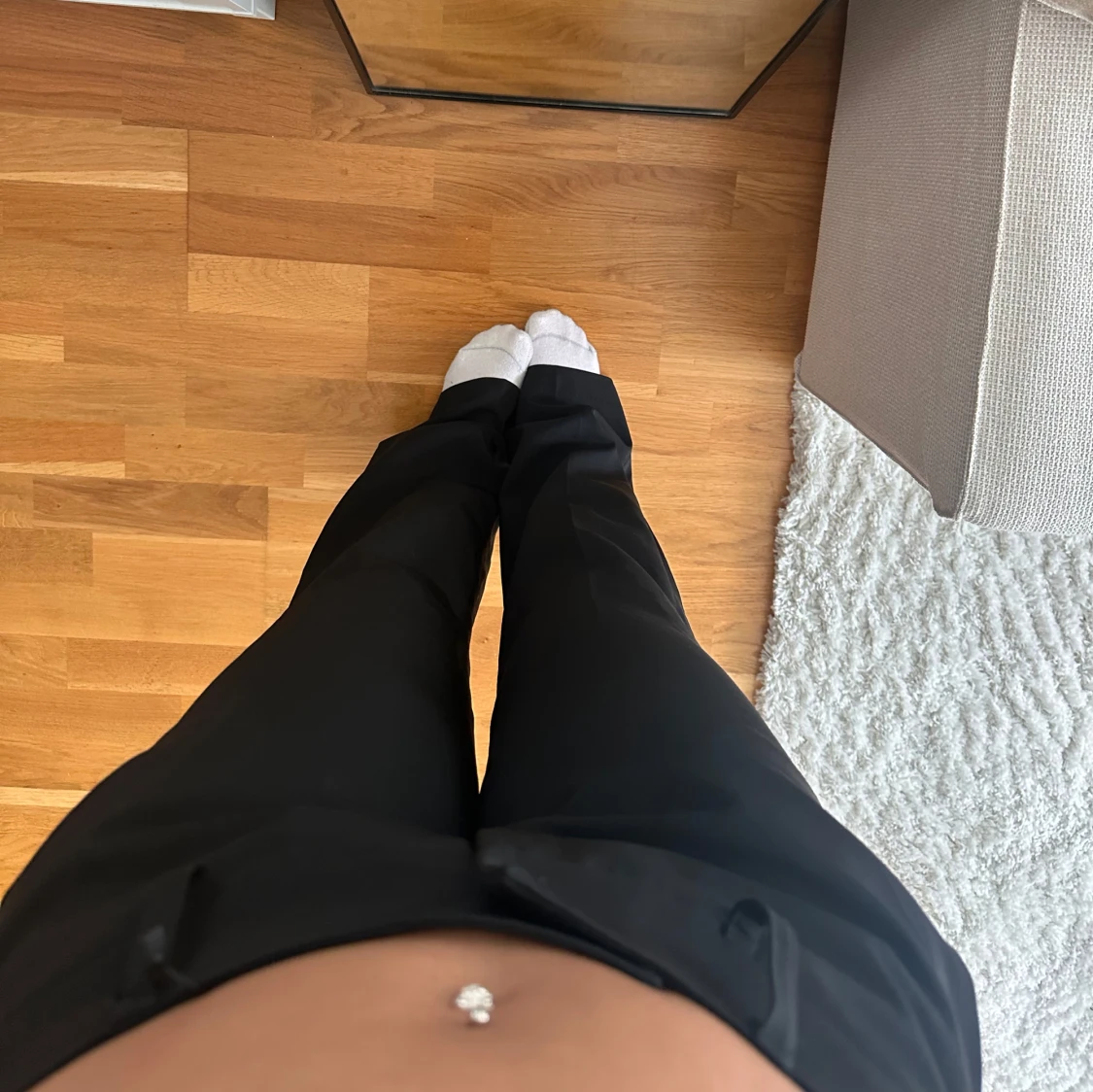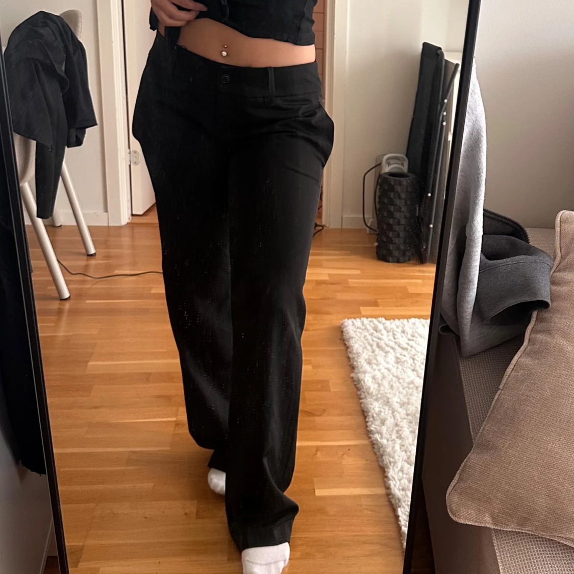 Säljer ett par klassiska svarta kostymbyxor med normal passform och raka ben och lågmidja, Byxorna har hällor för bälte och stängs med knapp och dragkedja. Innebrbenslängd 89 o midjemått 86🌟