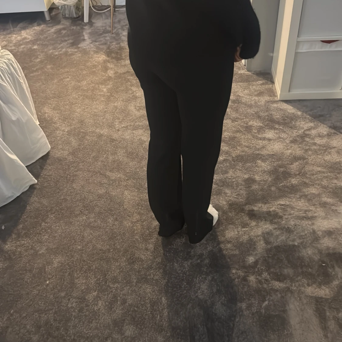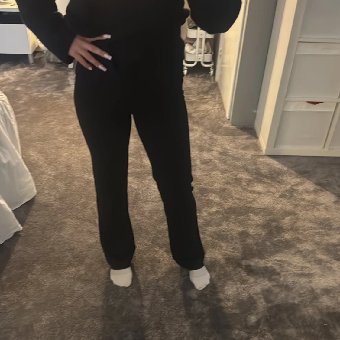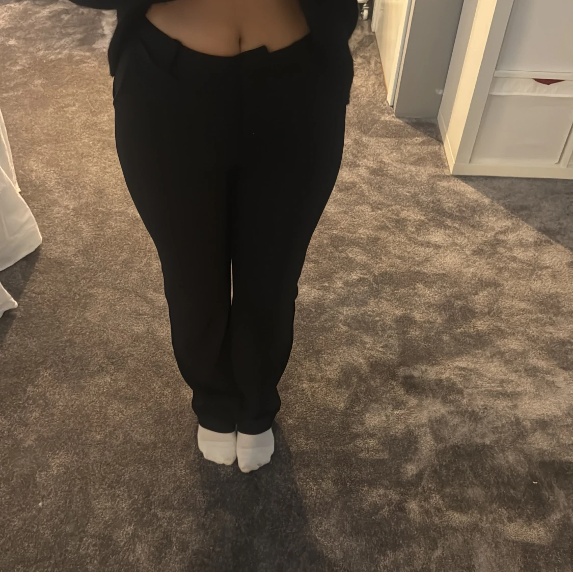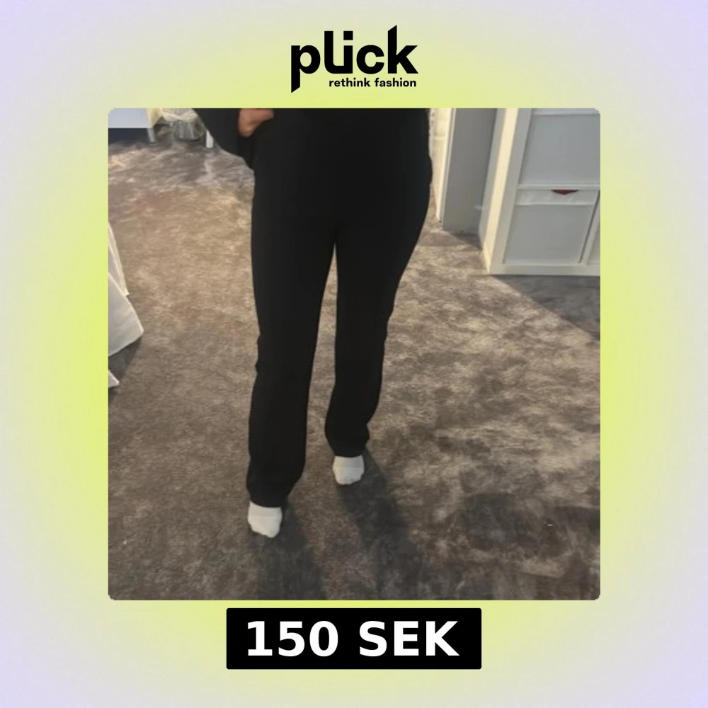 Säljer ett par svarta kostymbyxor med rak passform och klassisk look. Byxorna har normal midja och stängs med knapp och dragkedja framtill. Perfekta för en clean och stilren outfit.