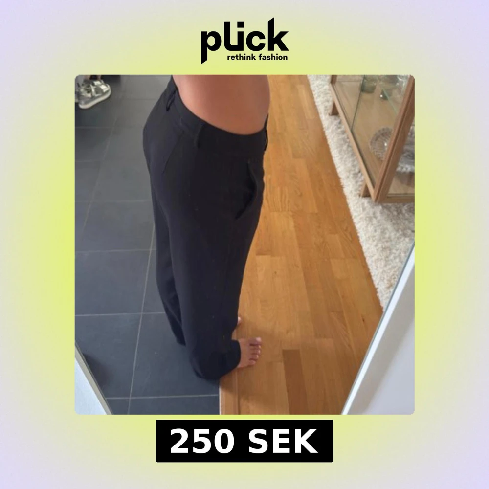 Snygga svarta kostymbyxor med raka, lite loose ben och klassiska fickor. Byxorna har hällor för bälte och stängs med dragkedja och knapp. Perfekta för en clean och stilren look, passar till både sneakers och boots. Innerbenslängd: 75cm Midjemått: 38cm