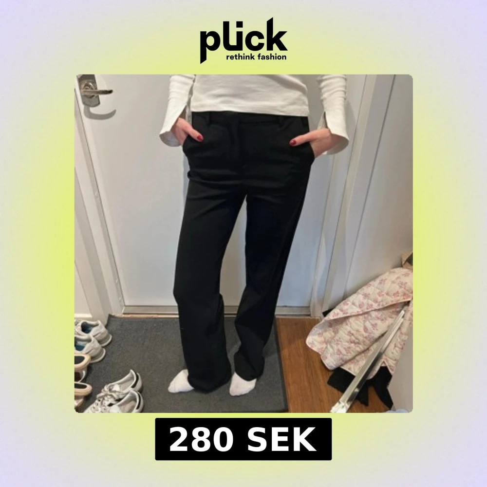 Snygga svarta kostymbyxor med klassisk rak passform och midja. Byxorna har hällor för bälte och diskreta fickor fram. Perfekta för en clean och stilren look, passar till både sneakers och boots. Storlek Xs ifrån veromoda skulle säga att det även passar S.