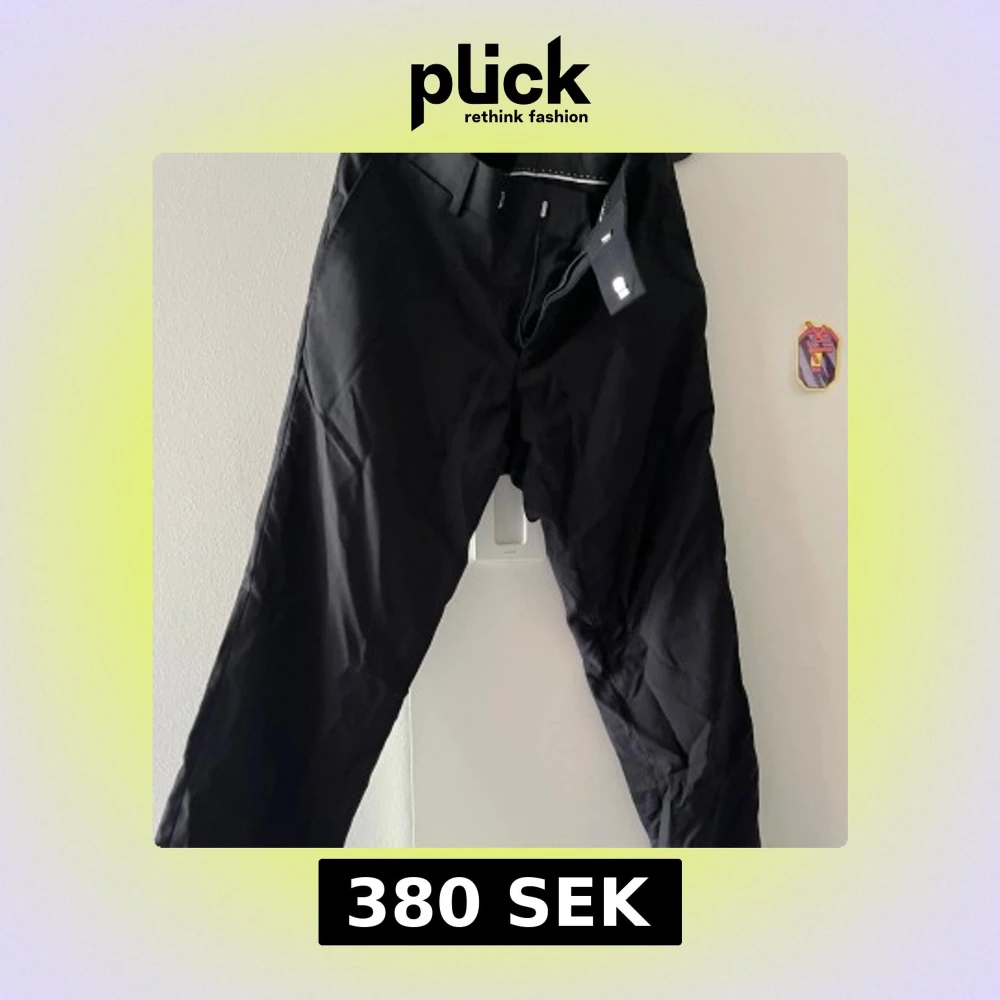 Snygga svarta kostymbyxor med raka ben och klassisk passform. Byxorna har bälteshällor, två fickor fram och två bakfickor med knapp. Perfekta till en stilren look och passar till skjorta eller t-shirt. Nyskick, kostar närmare 1300:- ny.