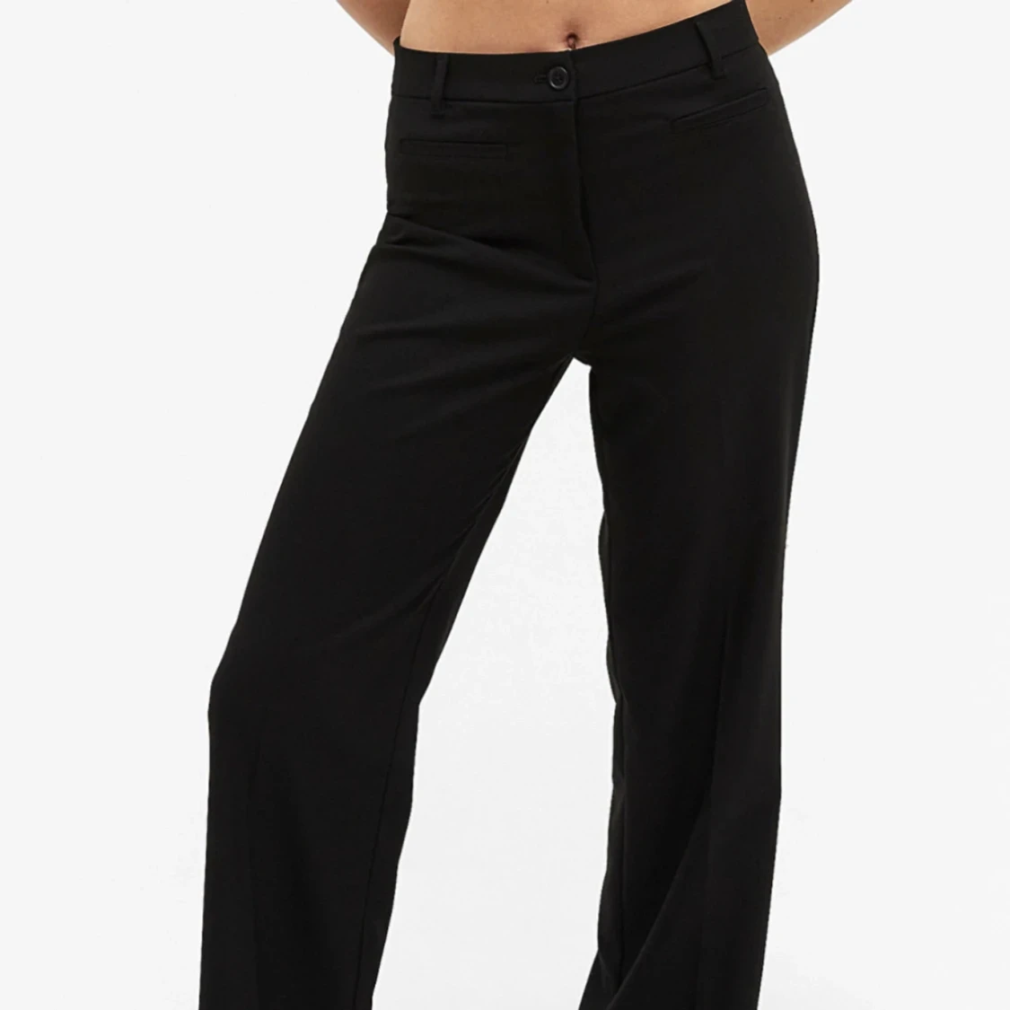 Snygga svarta kostymbyxor med raka, vida ben och klassisk midja. Byxorna har diskreta fickor fram och stängs med knapp och dragkedja. Perfekta för en clean och stilren look.
