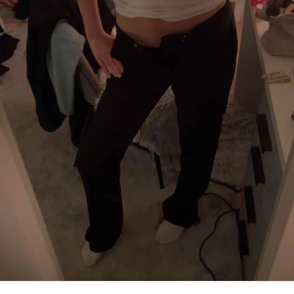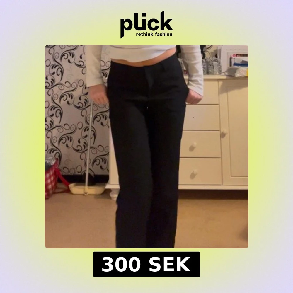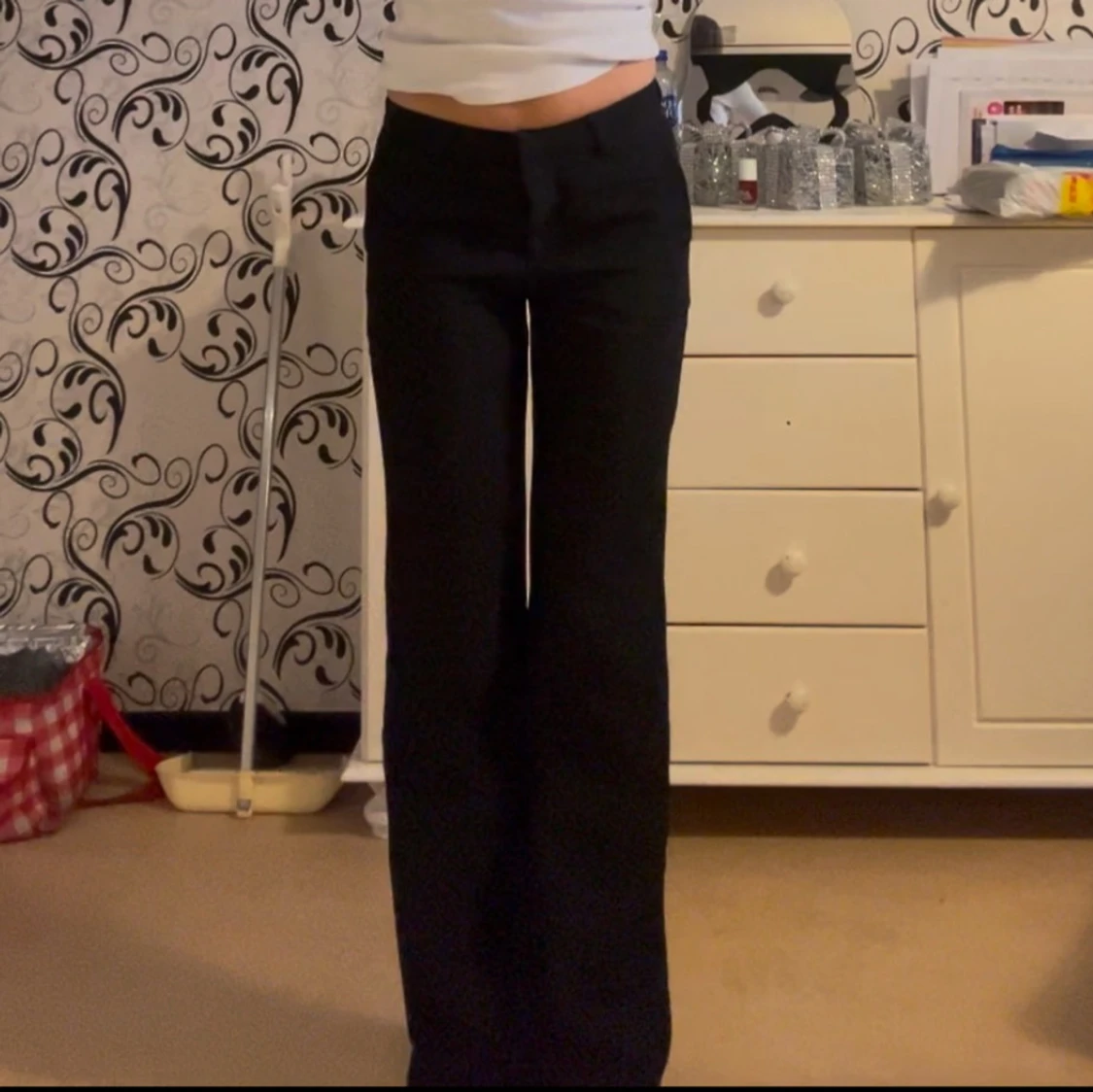 Snygga svarta kostymbyxor med låg midja och bootcut-stil. Perfekta för en stilren look. Byxorna har en klassisk design med dragkedja och knappar framtill.