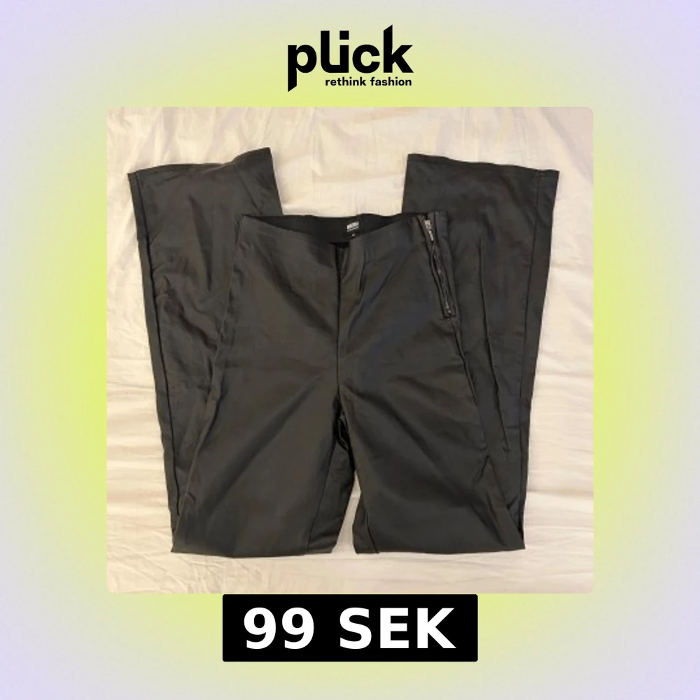 Snygga svarta byxor från Bubbleroom x Moa Mattsson, byxorna är i strl 38 och har en boot cut form. De är gjorda i ett glansigt material lite som fejk läder och sitter snyggt på.