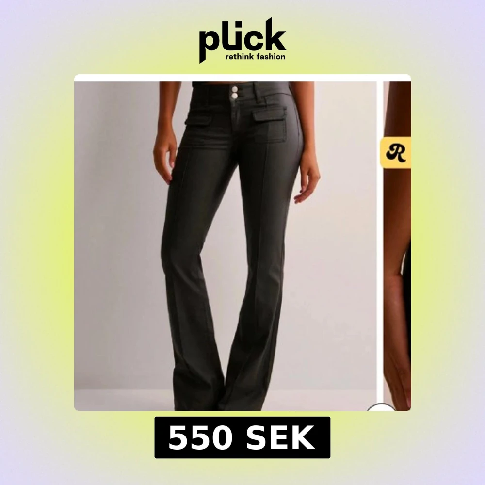 Snygga svarta bootcut byxor med två framfickor med lock och dubbla knappar i midjan. Byxorna har en lätt glansig finish. Använda en gång💕