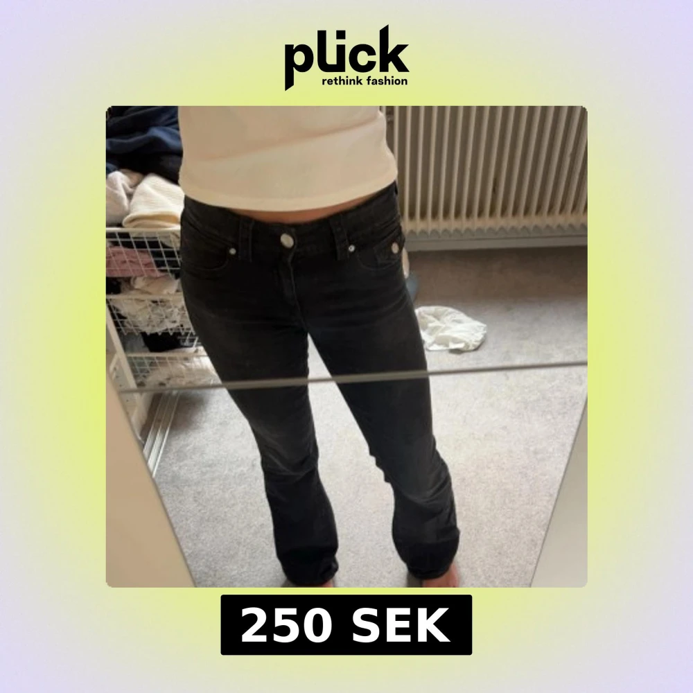 Säljer ett par svarta lågmidjase bootcut jeans från Gina Tricot i storlek 164. Jeansen har justerbara knappar i midjan.