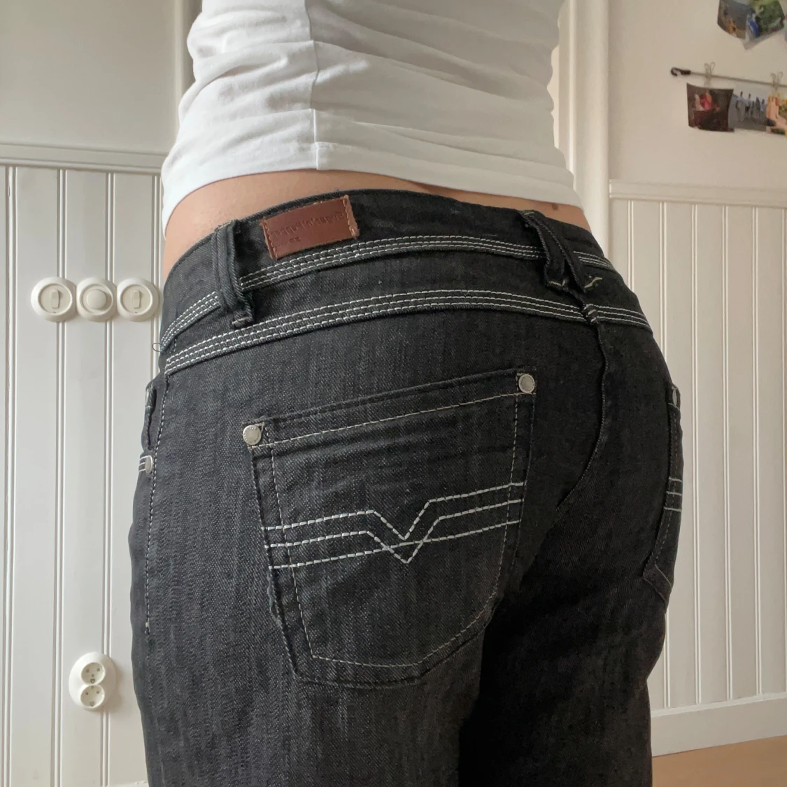 Snygga svarta jeans med bootcut passform och vita kontrastsömmar. Midjemått ca 40 och innerbenslängden 80 cm
