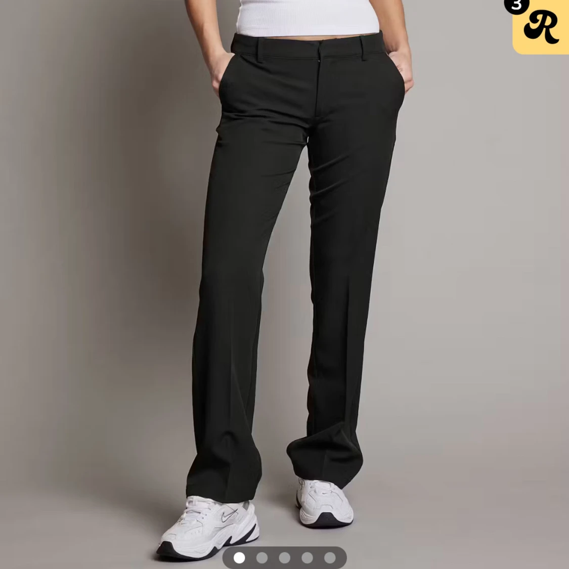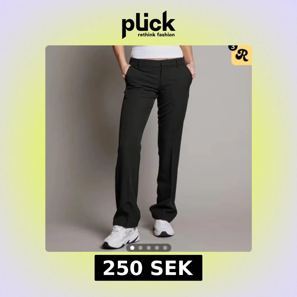Snygga svarta kostymbyxor som sitter tight upptill med utsvängda ben. Byxorna har hällor för bälte, fickor i sidorna och stängs med dragkedja och knapp. Väldigt basic. Från bikbok och nypris är 500