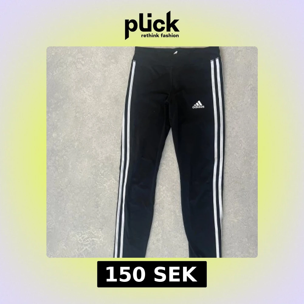 Snygga svarta leggings från Adidas med de klassiska tre vita ränderna längs sidorna. Perfekta för träning eller en avslappnad dag. Adidas-loggan är tryckt på ena benet.