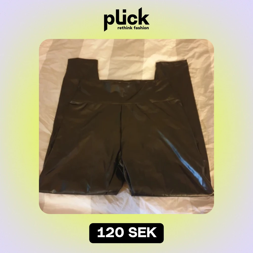 Säljer ett par svarta leggings i läderimitation i storlek L. De är gjorda av 90% polyester och 10% elastan, vilket gör dem stretchiga och bekväma. Perfekta för en cool och stilren look! Helt nya!