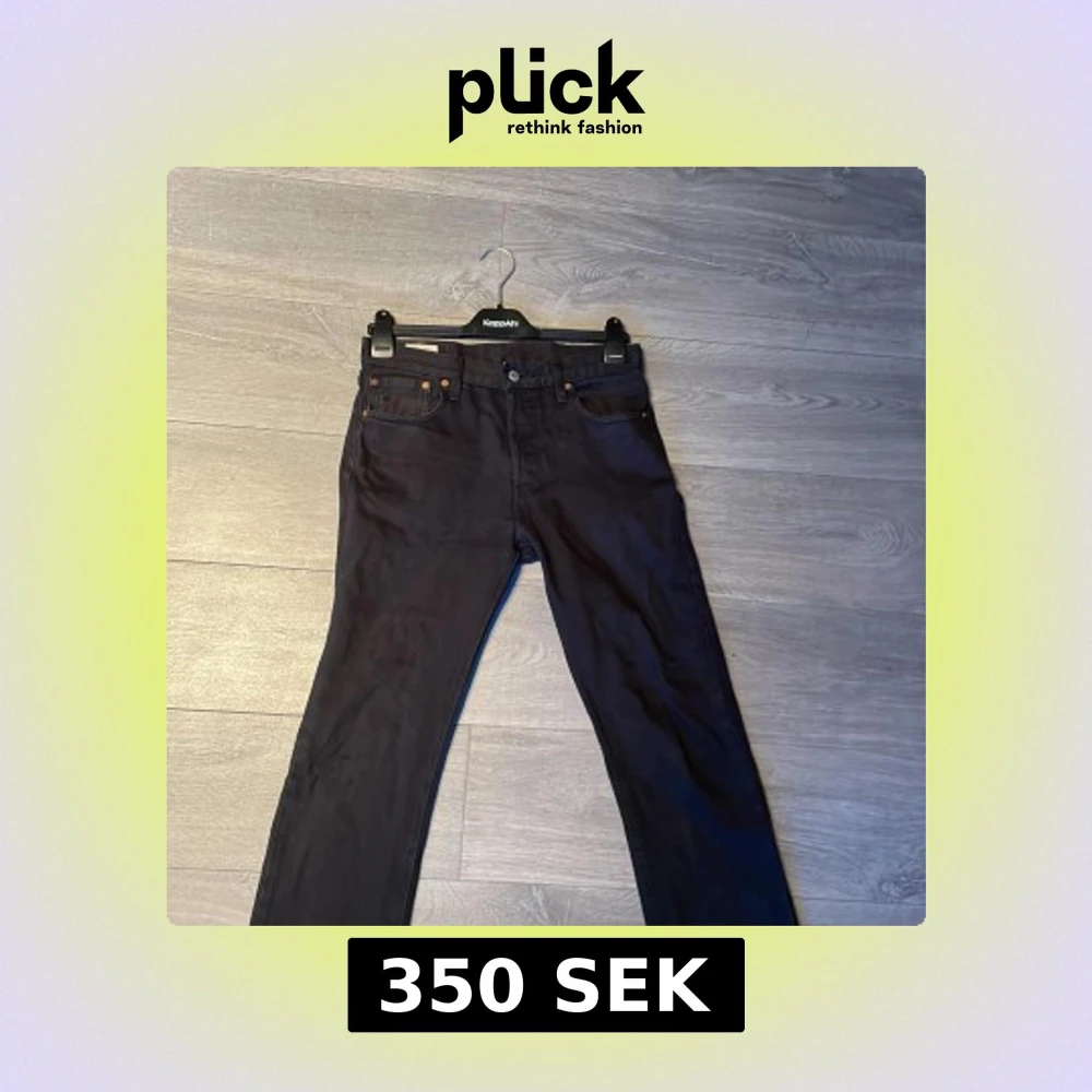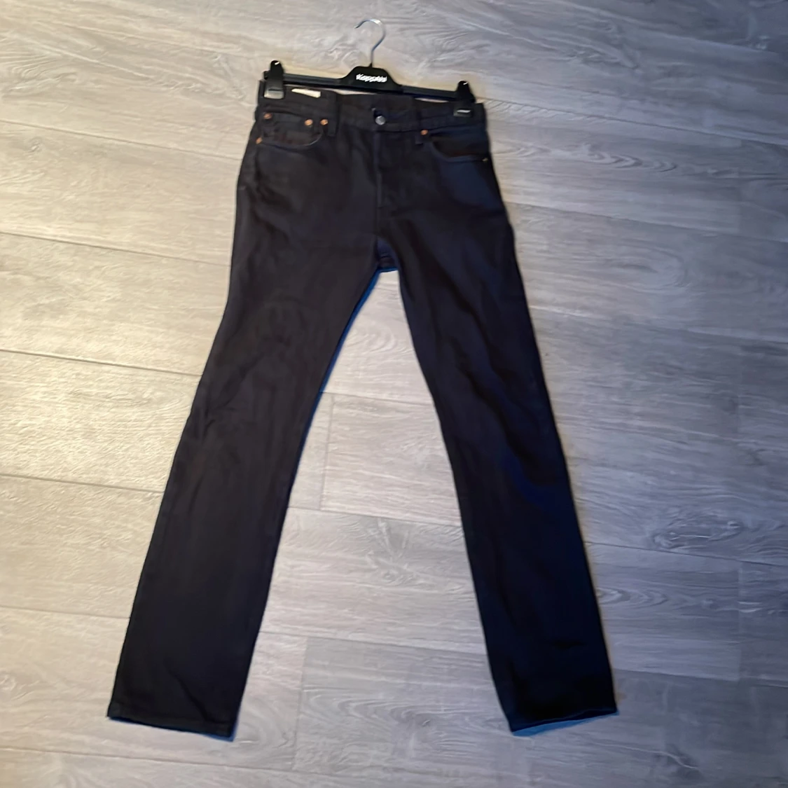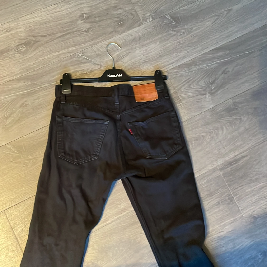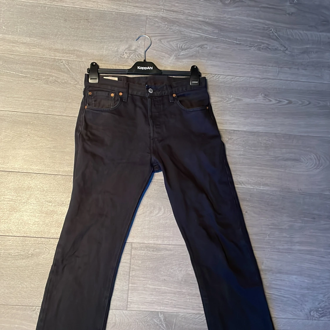 Säljer ett par svarta Levi's 501 jeans med klassisk straight fit. Jeansen har fem fickor, knappgylf och den ikoniska läderpatchen bak i midjan. Materialet är robust denim och färgen är riktigt mörk svart, perfekt till sneakers eller boots. Storlek W29 L32