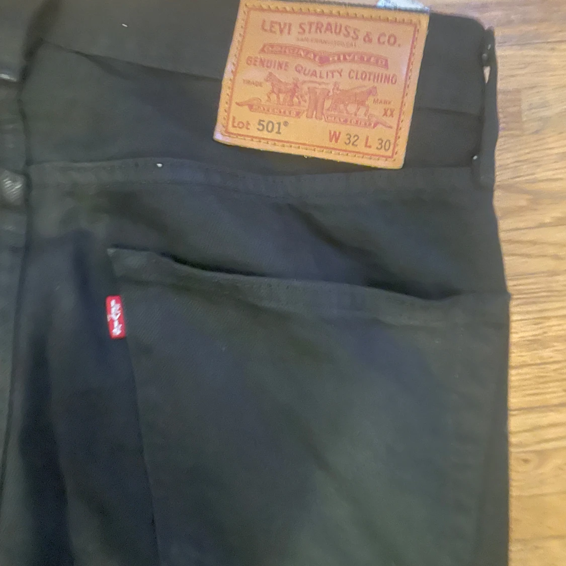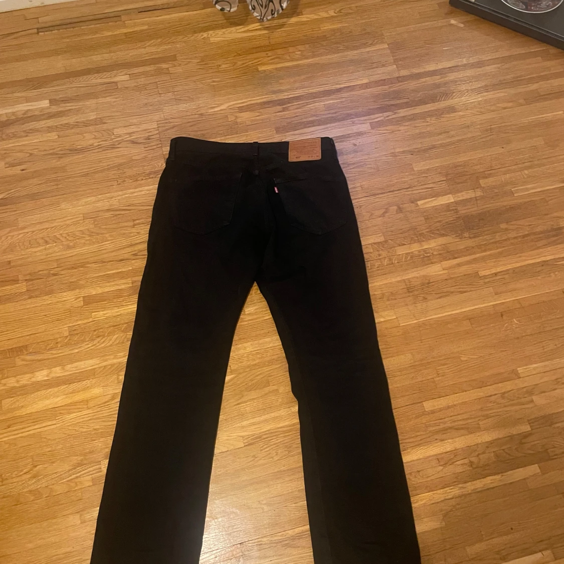 Säljer ett par svarta Levi's 501 jeans med klassisk straight fit och knappgylf. Byxorna har fem fickor, kopparfärgade nitar och den ikoniska läderpatchen bak. Passar dig som gillar tidlös stil och vill ha jeans som funkar till allt.