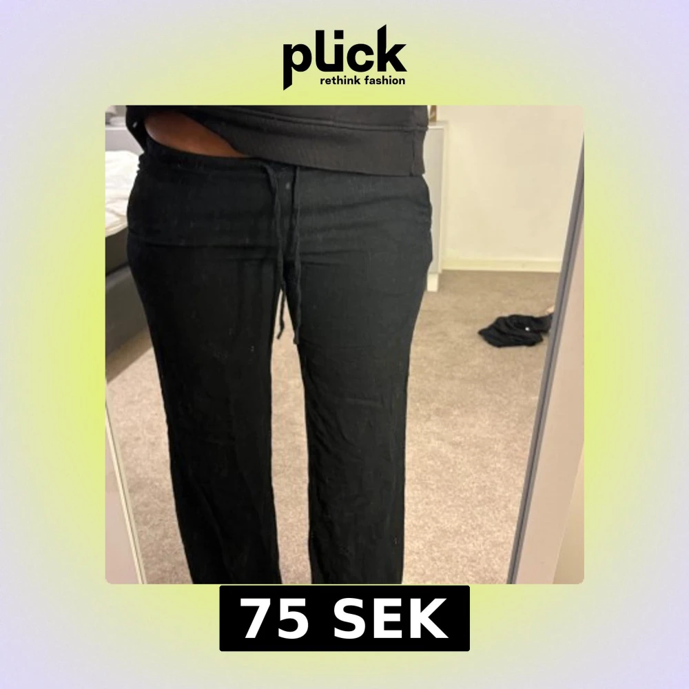Svarta linnebyxor som är lågmidjade. De är jättesnygga och storlek xxs de är förkorta på mig som är 163 men de går att ta upp sprätten där nere!