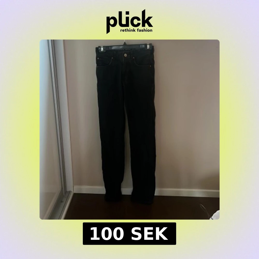 Svarta jeans med låg midja och raka ben. Klassisk femficksmodell i denim. Snygg passform och enkel att matcha med olika stilar. Har dock en lite slitning i enden