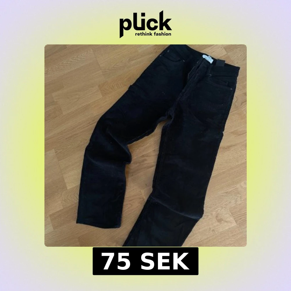 Säljer ett par svarta manchesterbyxor från H&M i storlek 36. Byxorna har klassisk femficksdesign och rak passform med mjukt, ribbat tyg. Passar nog XS