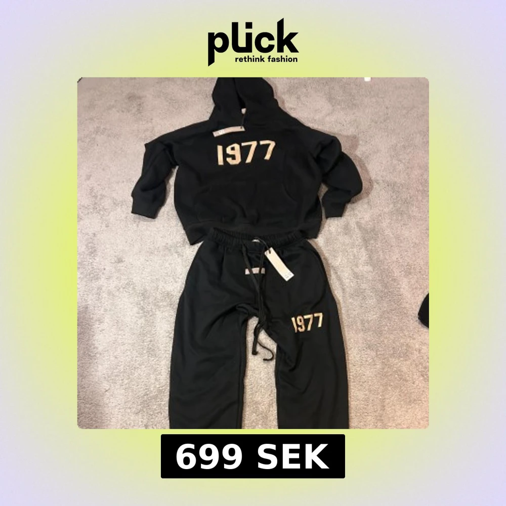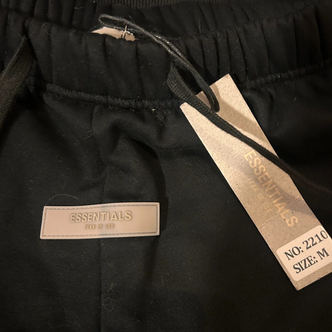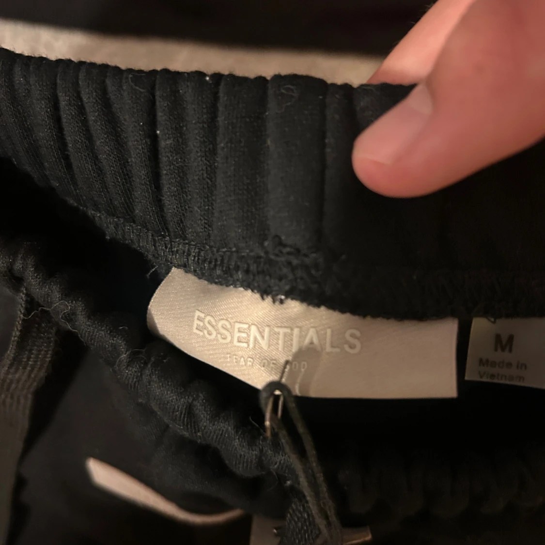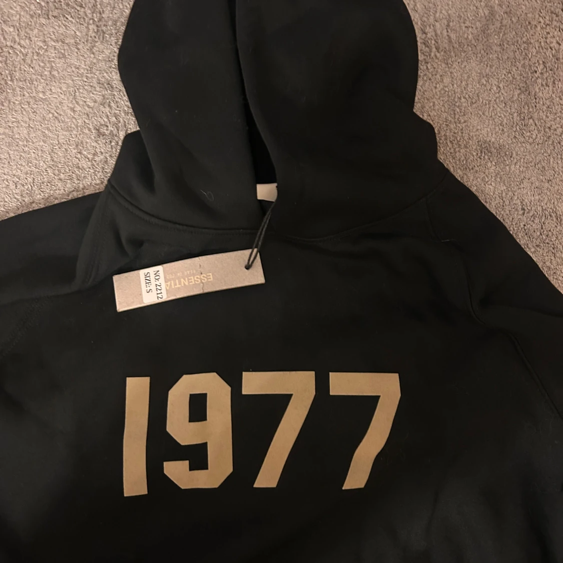 Svarta mjukisbyxor från Essentials Fear of God med beige '1977'-tryck på benet. Byxorna har elastisk midja med snörning och en diskret Essentials-logga framtill. Sköna och stilrena, perfekta för en avslappnad look.
