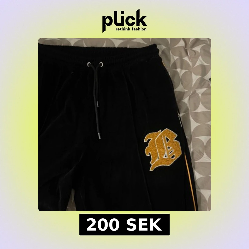 Snygga svarta mjukisbyxor från boohooMAN med ett stort broderat gult B på sidan. Byxorna har en elastisk midja med snörning och är tillverkade i ett mjukt material för extra komfort. Vid snabbaffär kan priset diskuteras ‼️‼️