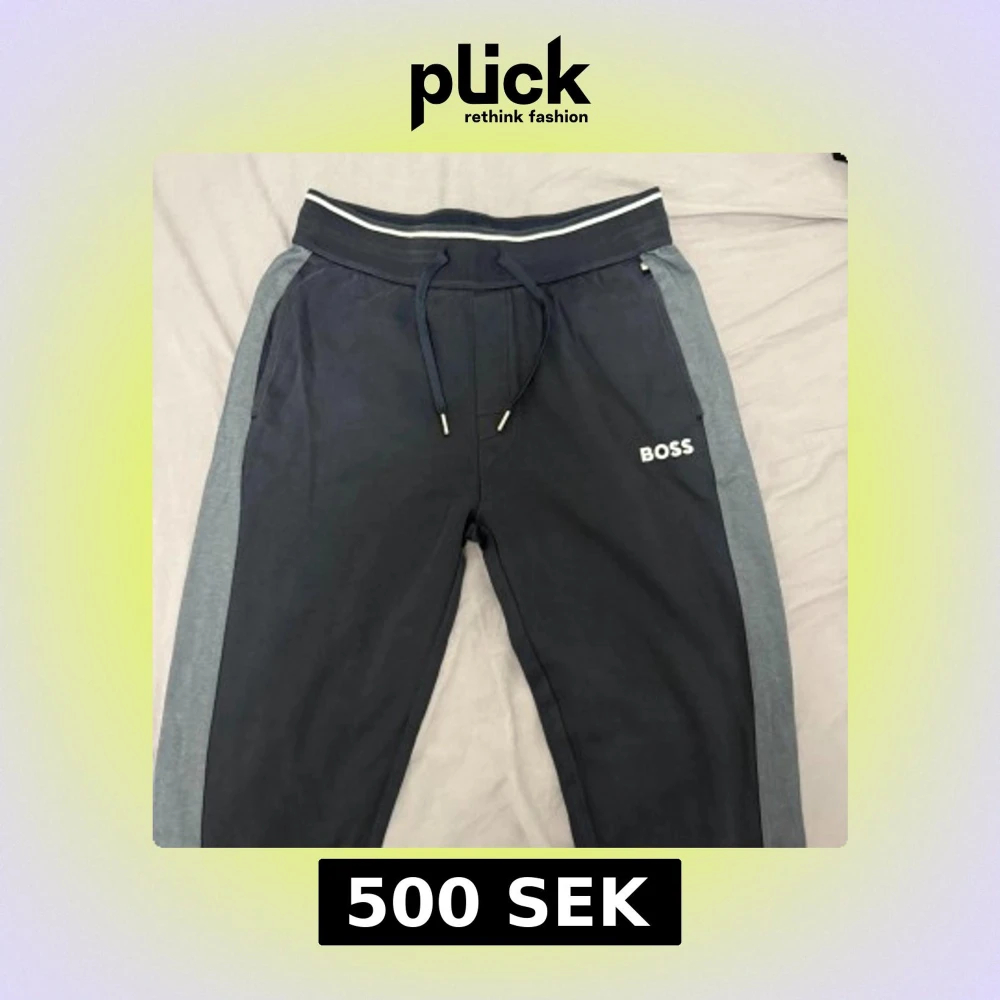 Snygga svarta mjukisbyxor från BOSS med grå sidopaneler och vit logga på benet. Byxorna har dragsko i midjan och ribbad mudd upptill. Perfekta för chill eller streetwear. Materialet är mjukt och bekvämt, troligtvis bomullsmix.