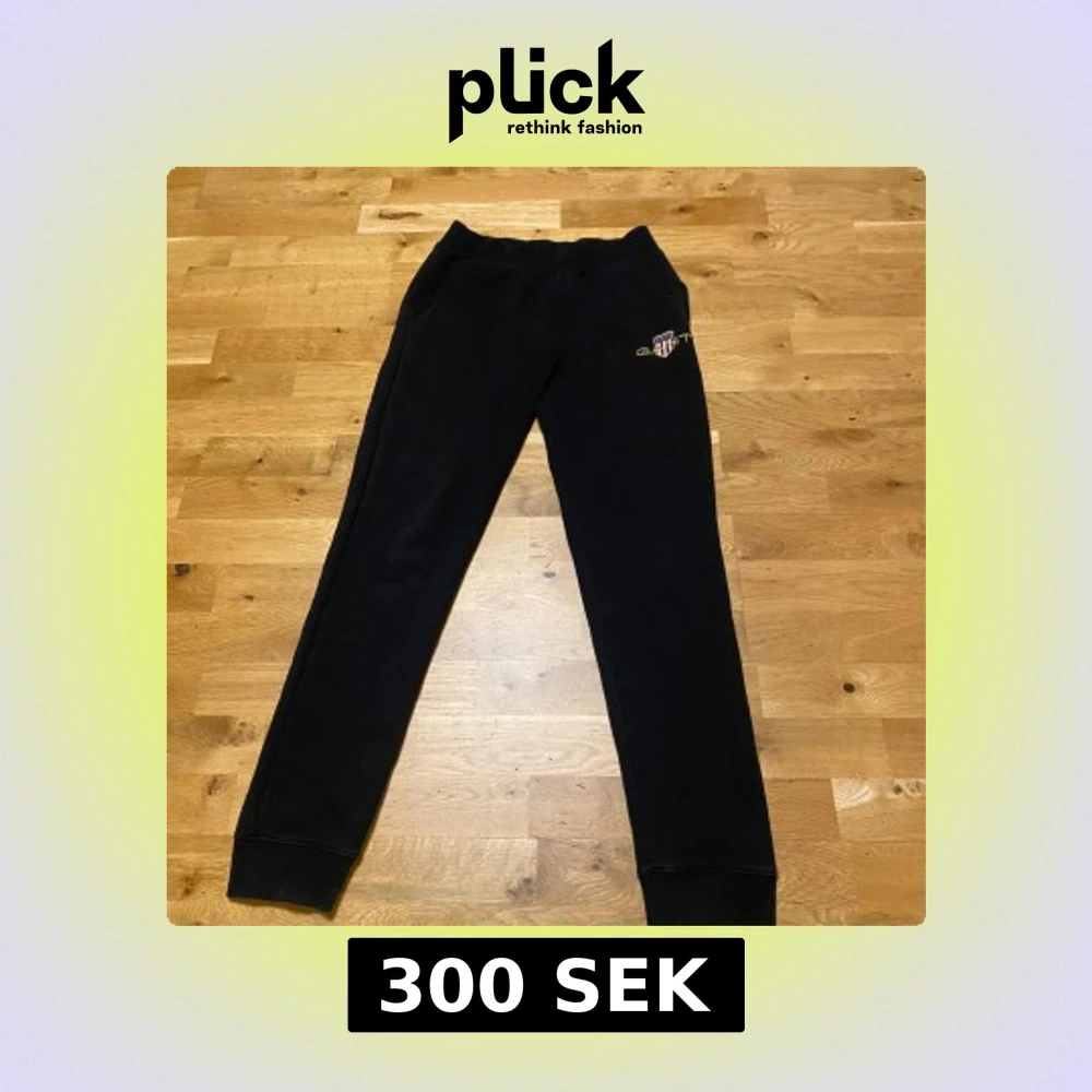 Säljer ett par svarta mjukisbyxor från GANT. Byxorna har en enkel design med ribbade muddar vid bensluten och en diskret logga på sidan. Perfekta för en avslappnad stil. Byxorna är i storlek 170cm och i riktigt bra skick, hör av dig via intresse!