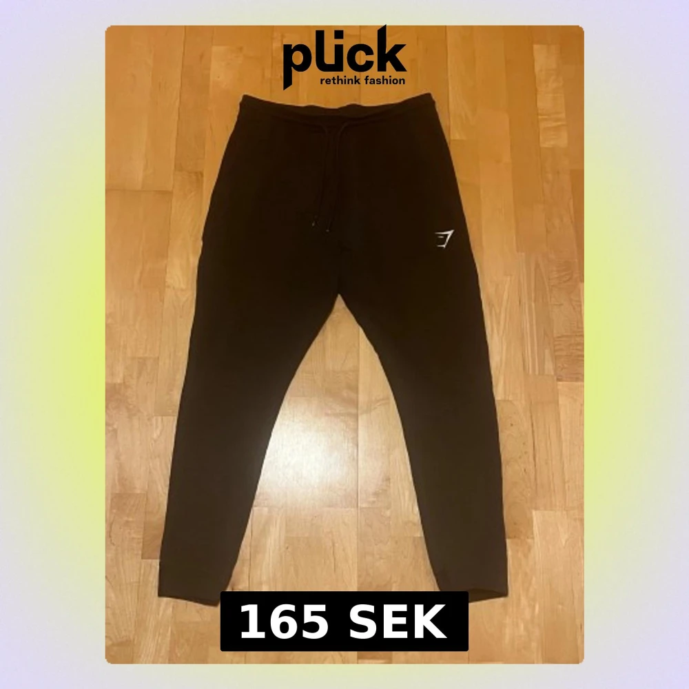 Svarta mjukisbyxor från Gymshark i storlek M. De har en slim passform, snörning i midjan och en vit Gymshark-logga på vänster lår samt två fickor med dragkedja. Materialet är mjukt och skönt, perfekt för vardag eller träning.