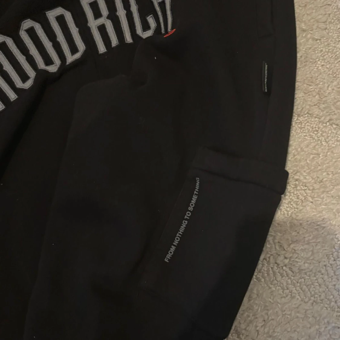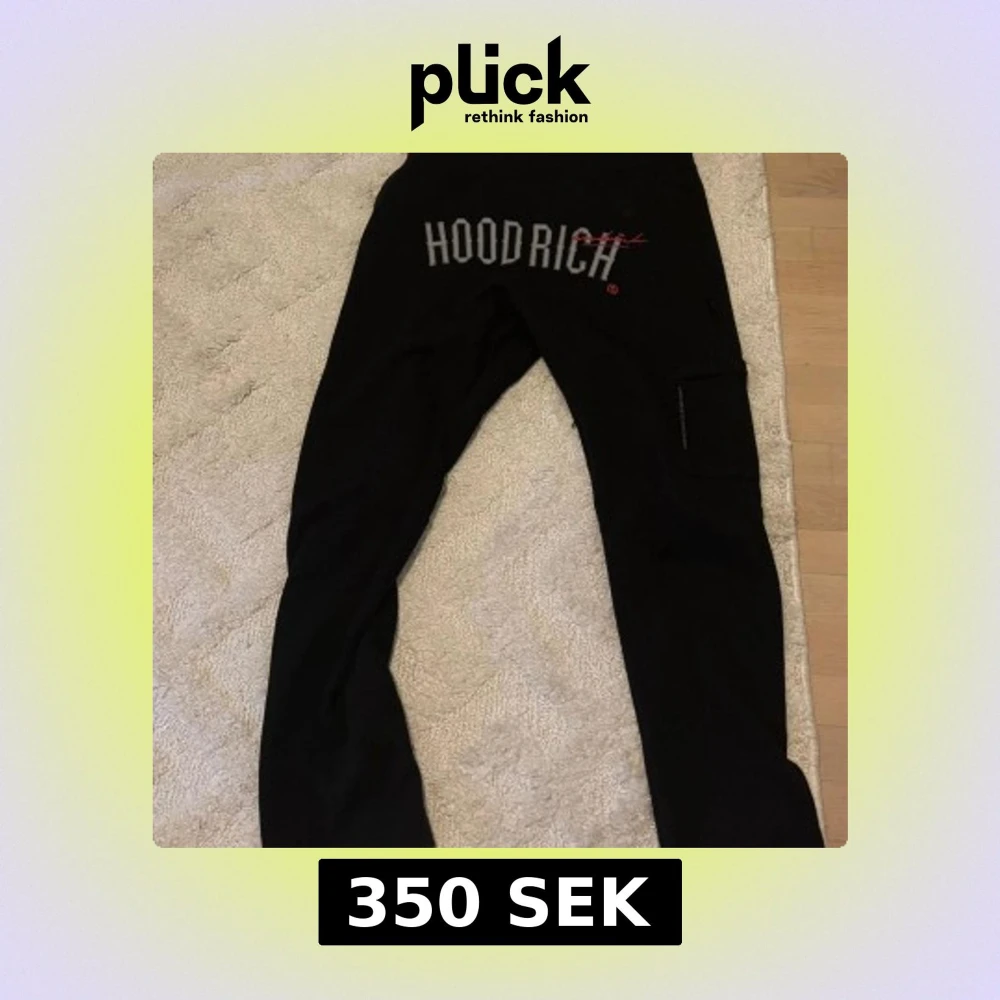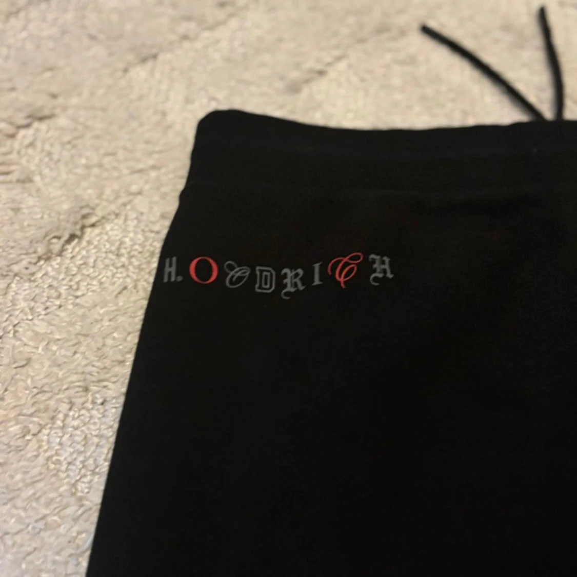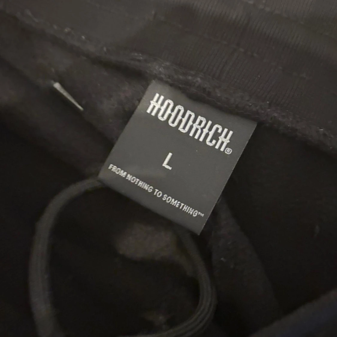 Svarta mjukisbyxor från Hoodrich med stor logga framtill och mindre tryck bak. Byxorna har dragsko i midjan och en ficka på sidan. Sköna och stilrena, perfekta för chill eller streetwear. Materialet är mjukt och bekvämt.