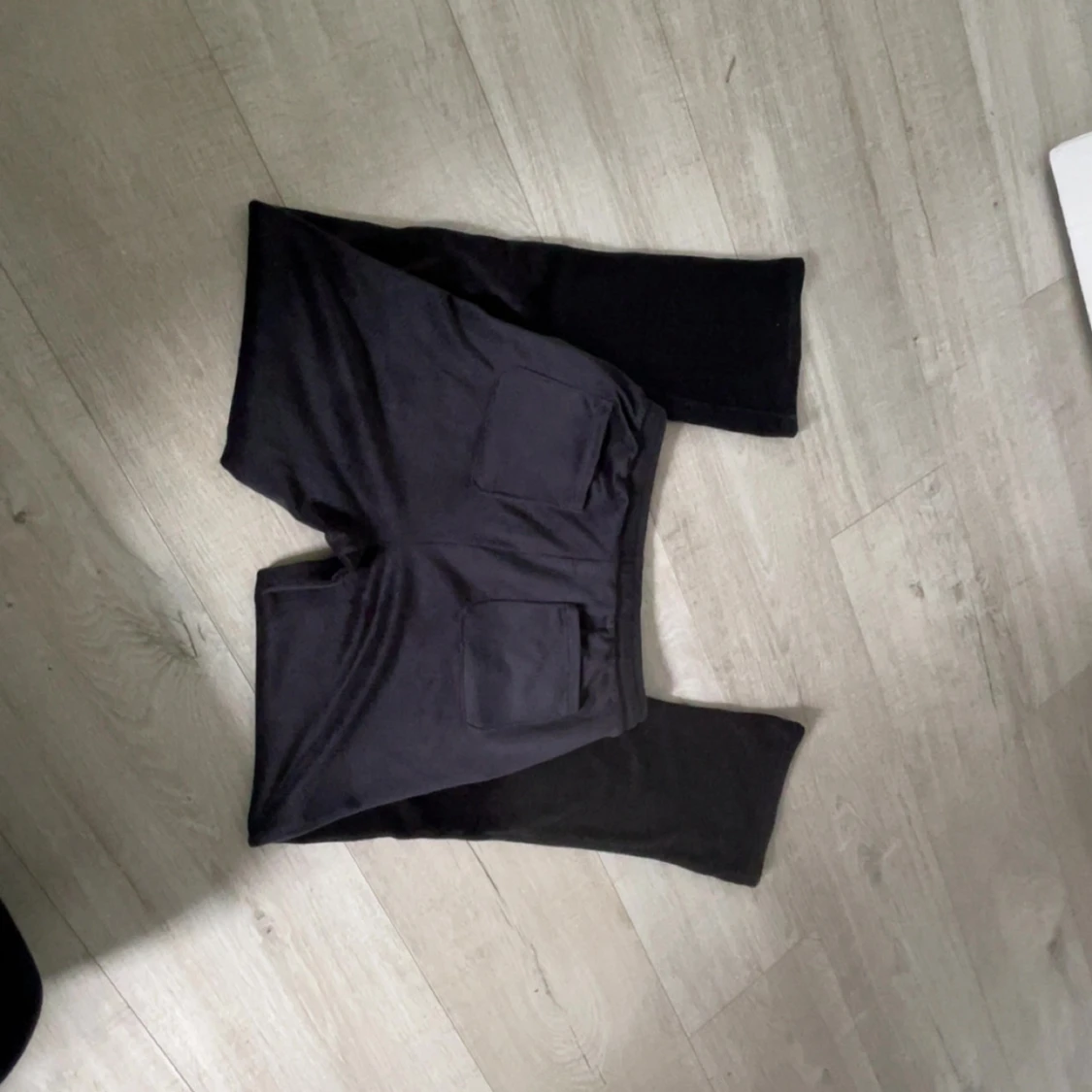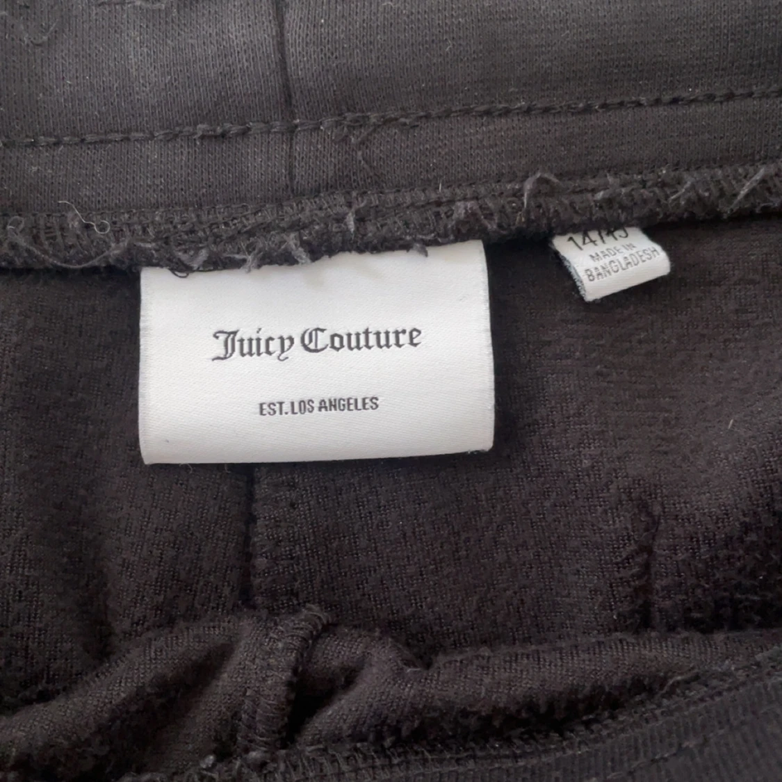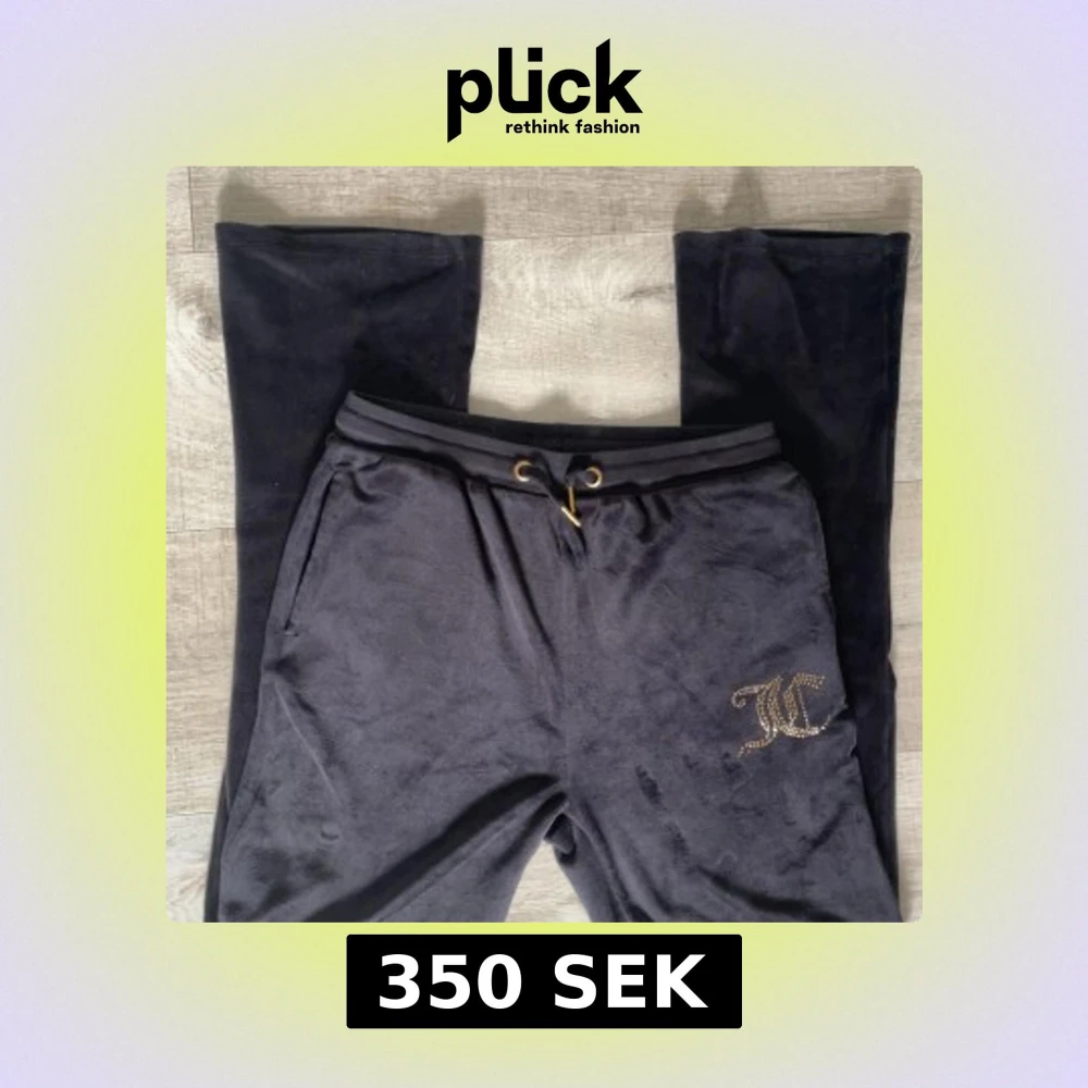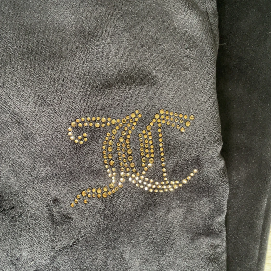 Mysiga svarta mjukisbyxor från Juicy Couture med guldfärgade nitar i loggan på ena benet. Byxorna har resår och snörning i midjan samt fickor både fram och bak. Perfekta för en avslappnad stil.