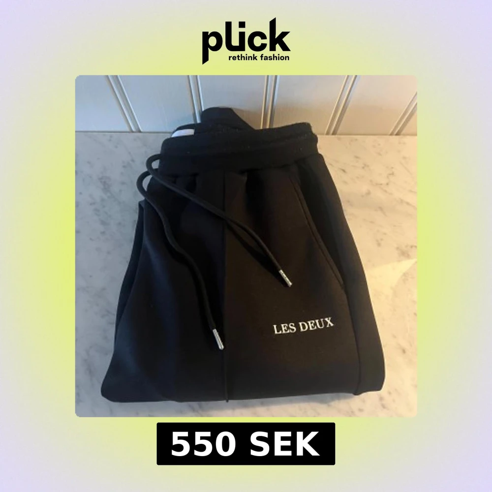 Svarta mjukisbyxor från Les Deux med broderad vit logga på benet. Byxorna har snörning i midjan och är tillverkade i mjukt material som känns riktigt skönt. Passformen är normal och de har raka ben med diskreta sömdetaljer framtill. Köpt helt ny, för 1200!