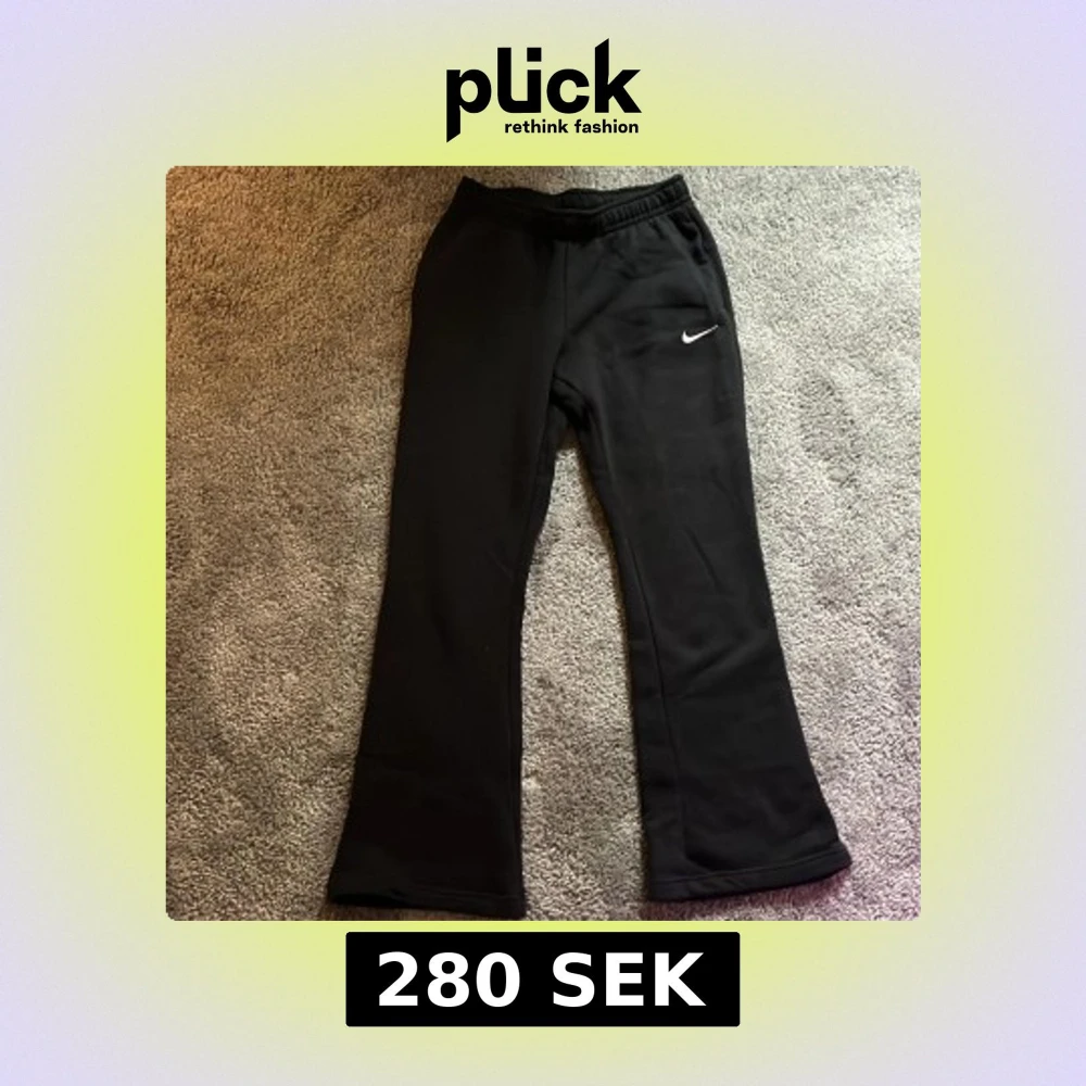 Säljer ett par svarta mjukisbyxor från Nike. Byxorna har en bekväm passform och är perfekta för en avslappnad stil. De har en elastisk midja för extra komfort. Den är bootcut. Säljer pga för liten för mig