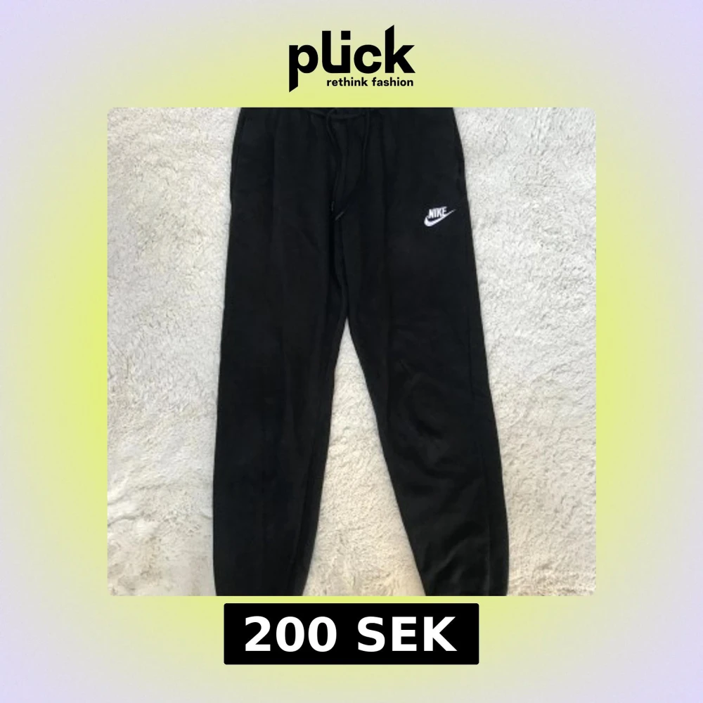 Säljer ett par svarta mjukisbyxor från Nike med elastisk midja och dragsko. Byxorna har en avslappnad passform och är perfekta för en bekväm stil. Nike-loggan är tryckt i vitt på benet.