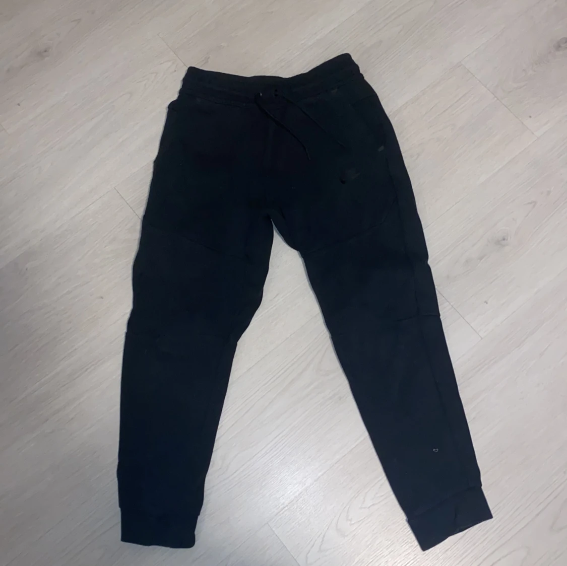 Säljer ett par svarta mjukisbyxor från Nike. Byxorna har en bekväm passform med snörning i midjan och ribbade muddar vid bensluten. Perfekta för en avslappnad stil.