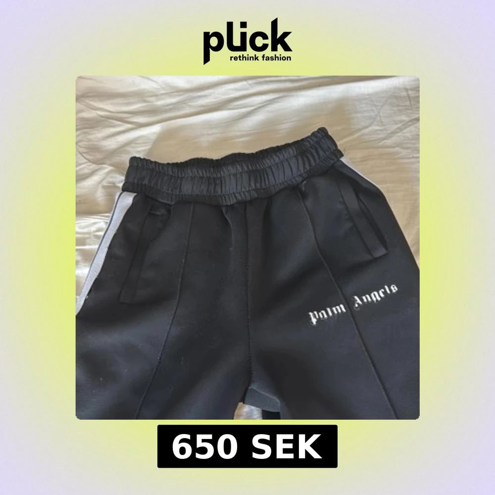 Snygga svarta mjukisbyxor från Palm Angels med vit logga på benet. Byxorna har elastisk midja och vita ränder längs sidorna. Perfekta för en avslappnad stil. Loggan är ganska sliten men annars i hyfsat skick