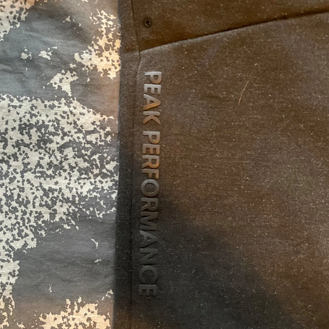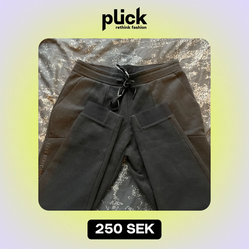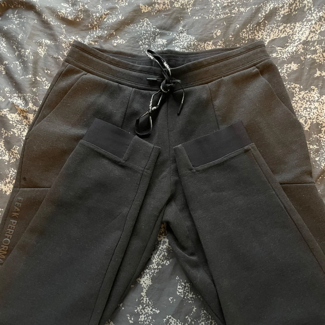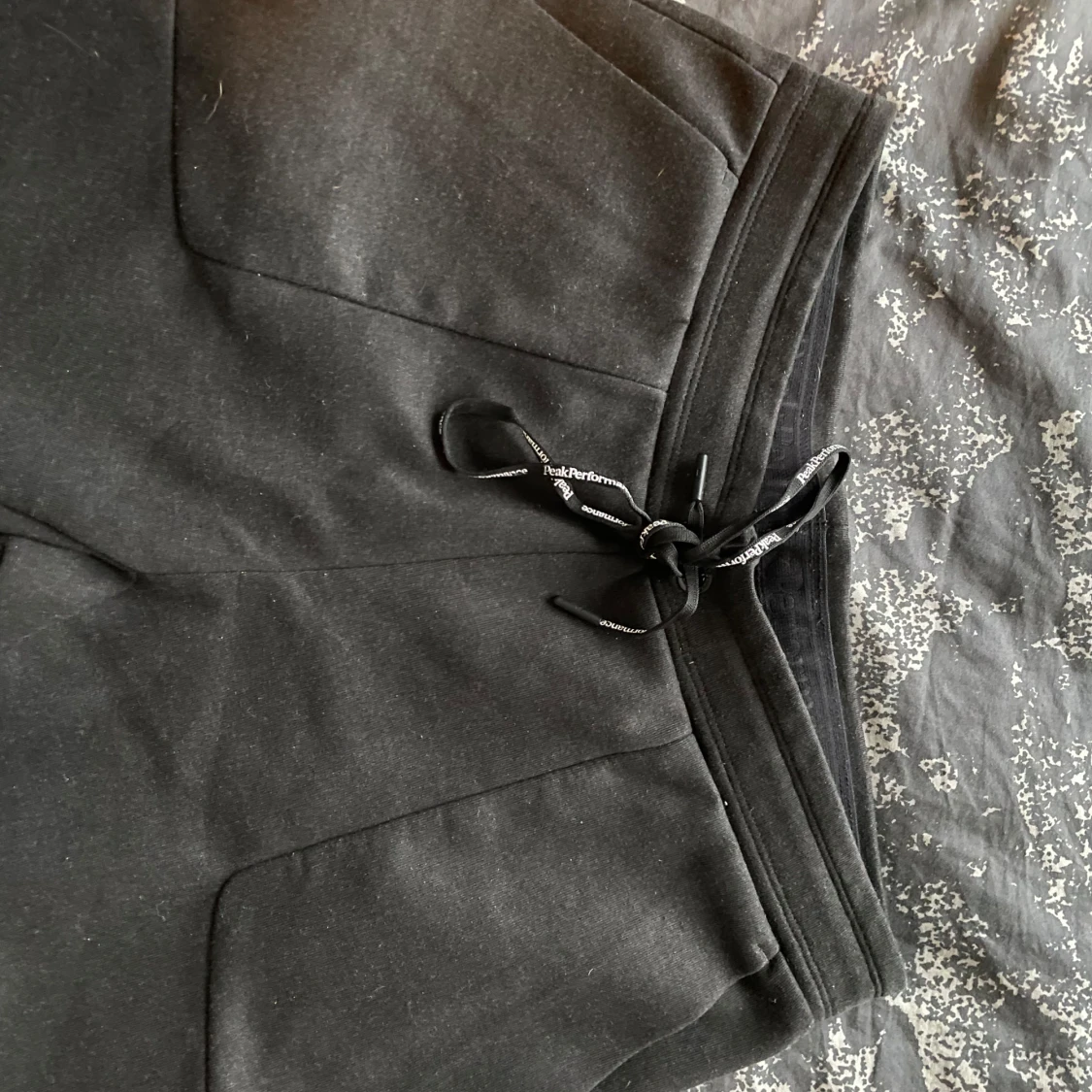 Säljer ett par svarta mjukisbyxor från Peak Performance i bra skick. De har en bekväm passform med snörning i midjan och praktiska fickor. Perfekta för en avslappnad dag eller träning. Byxorna har en diskret logga längs benet och en dragkedja på bakfickan.