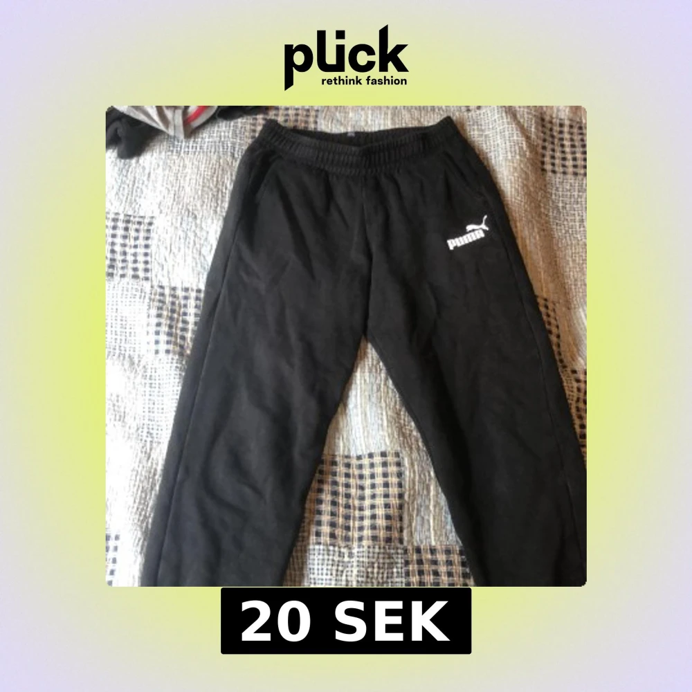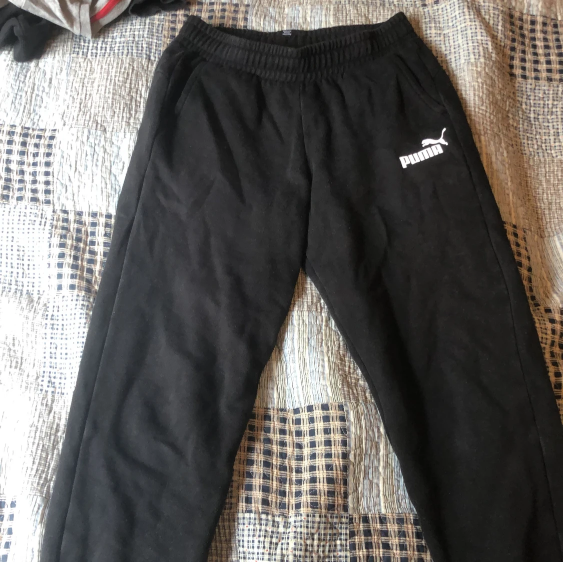 Svarta mjukisbyxor från Puma med resår i midjan och vit Puma-logga på vänster lår. Perfekta för chill eller träning, mjukt material och klassisk passform.
