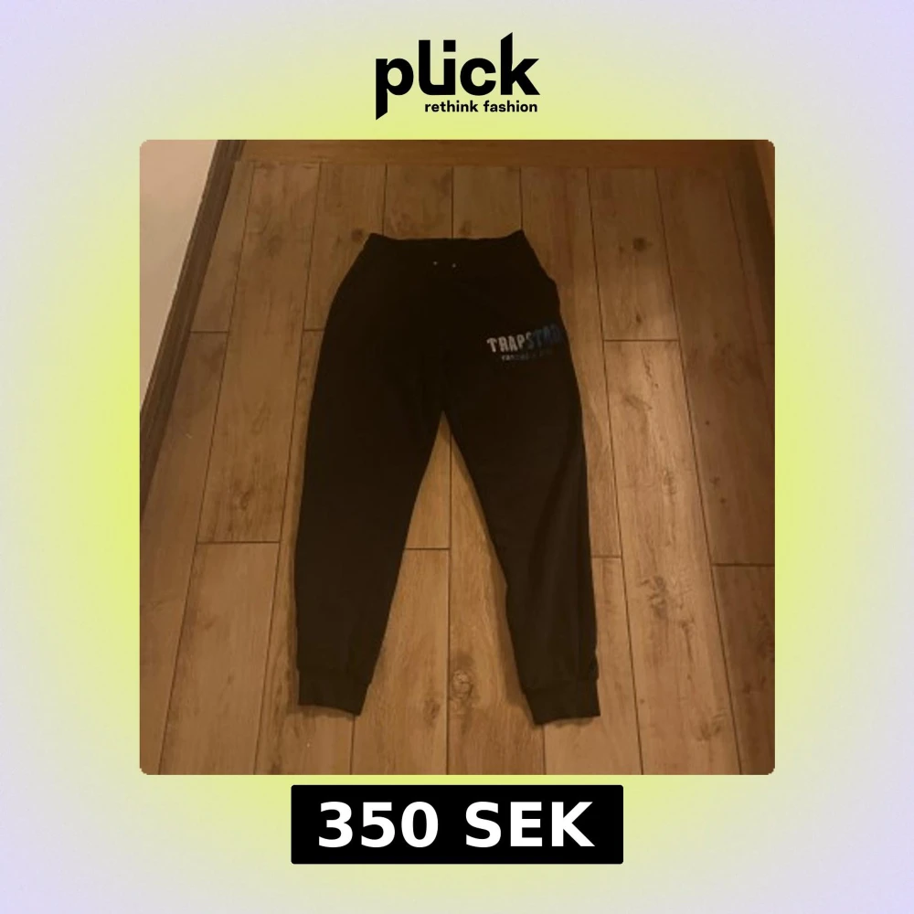 Säljer ett par svarta mjukisbyxor från Trapstar med elastisk midja och muddar vid bensluten. Byxorna har en tryckt logga i blått och vitt på ena benet. Perfekta för en avslappnad stil.